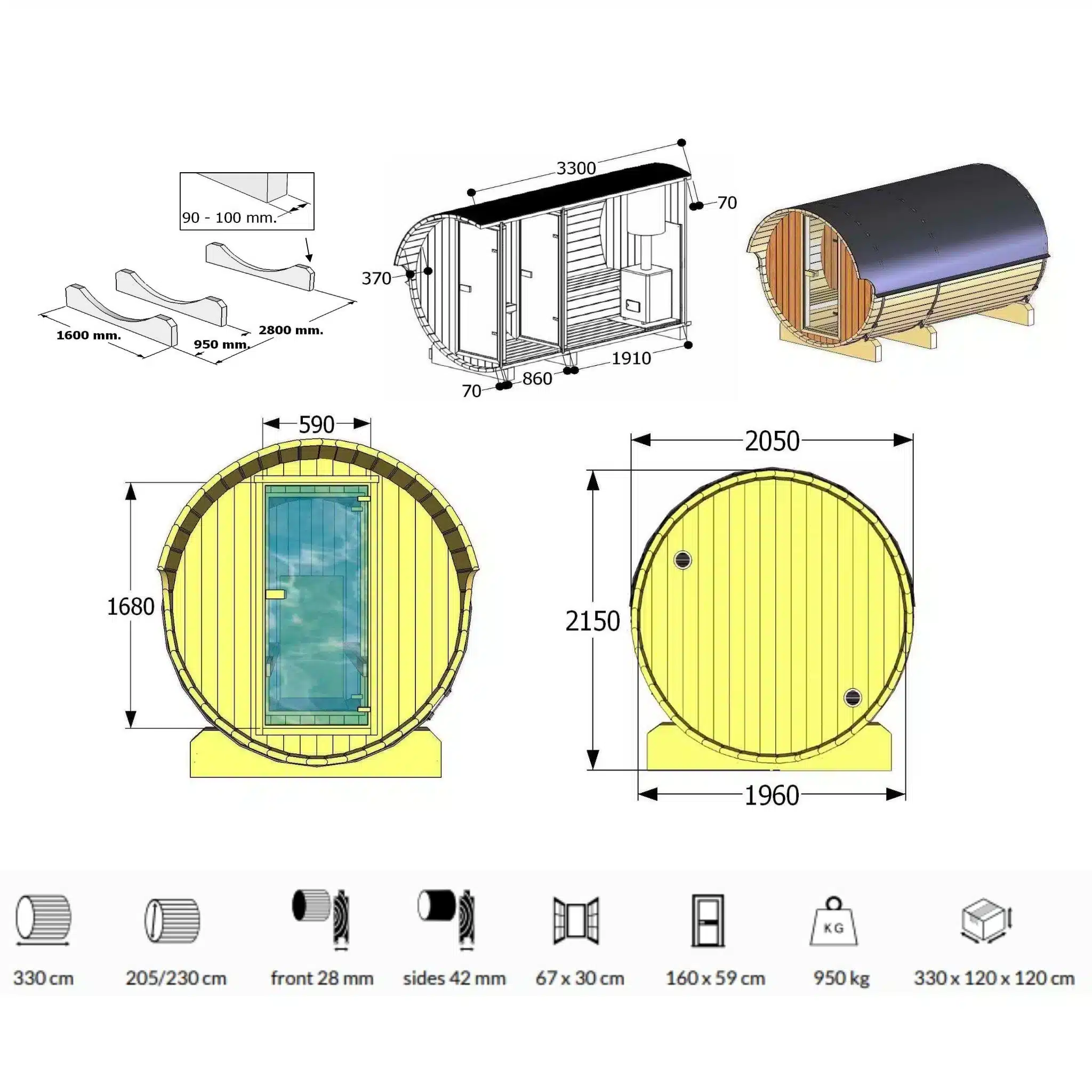 Ehala 330 Tünnisaun ühendab kvaliteetse käsitöö, funktsionaalsuse ja kaasaegse disaini. Valmistatud vastupidavast termopuidust, on see 3,3 meetri pikkune saun ideaalne kuni neljale inimesele, pakkudes mugavat eesruumi ja praktilist katusealust. Sobib suurepäraselt nii lõõgastuseks kui ka seltskondlikeks koosviibimisteks, olles täiuslik täiendus igale koduõuele või järveäärsele puhkealale.