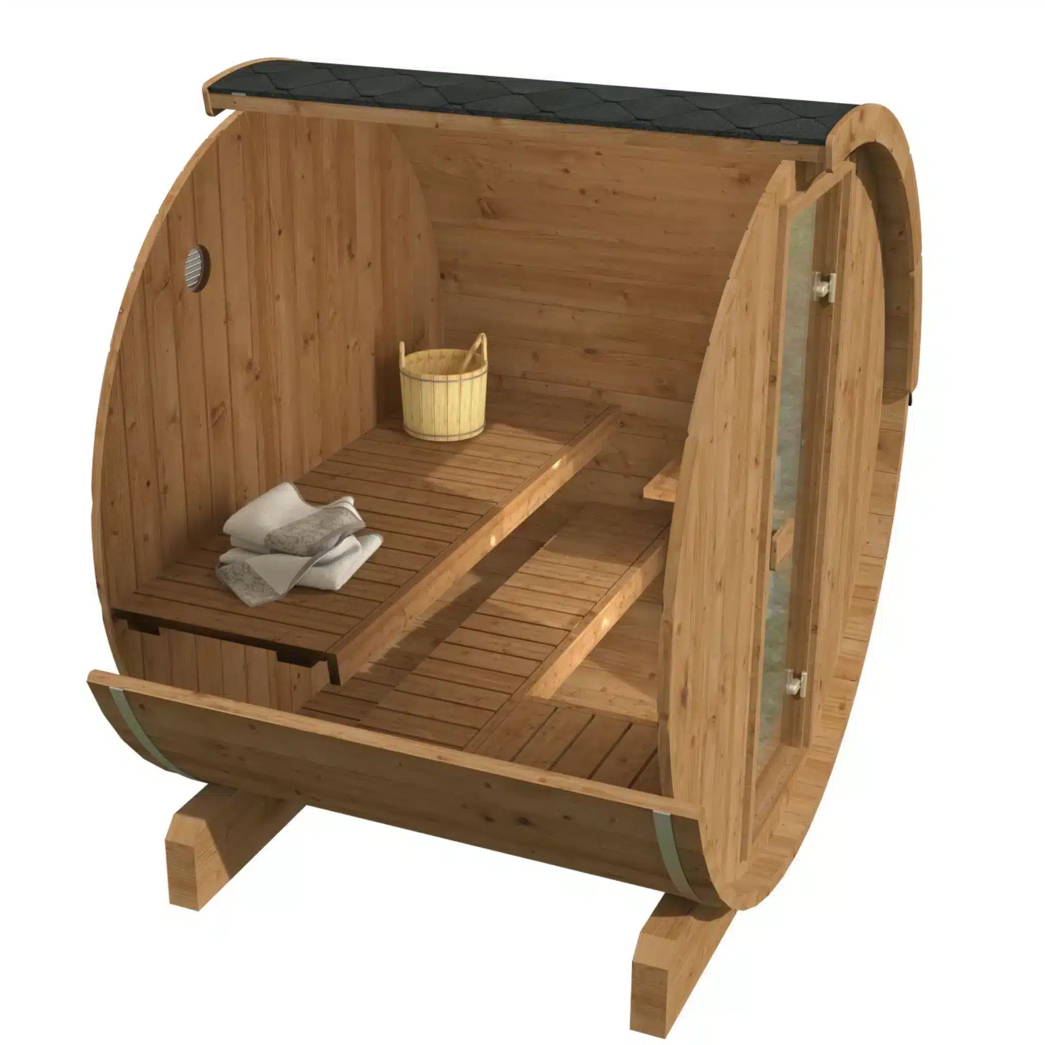 Saun on valmistatud kvaliteetsest kuusepuidust, mis tagab vastupidavuse erinevates ilmastikutingimustes ning säilitab oma kauni välimuse aastateks. Tünnikujuline disain tagab ühtlase soojaringluse, pakkudes mugavat ja lõõgastavat saunaelamust. See saun on ideaalne nii individuaalseks kasutamiseks kui ka väiksematele seltskondadele, kes soovivad oma õuealale luksust lisada.