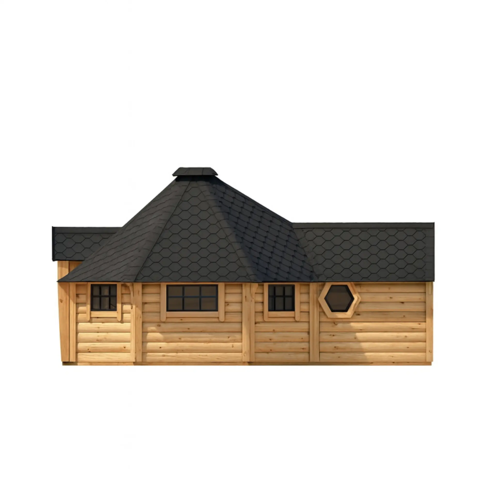 Hoone on valmistatud kvaliteetsest ja vastupidavast männipuidust, mille 45 mm paksused seinad tagavad suurepärase stabiilsuse ja soojapidavuse. BBQ-ruumi katus on kaetud Soome bituumensindlitega, samal ajal kui saunaruumis on soojustatud katusekonstruktsioon 50 mm kivivillaga, mis tagab tõhusa soojapidavuse ja mugava saunakogemuse.