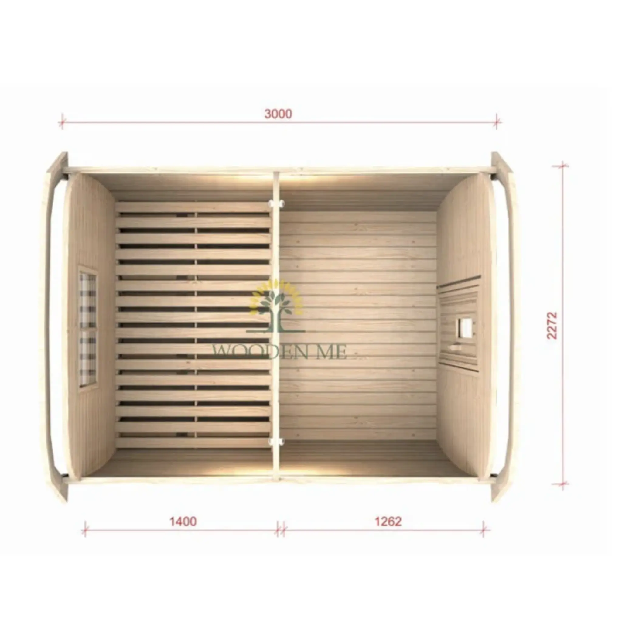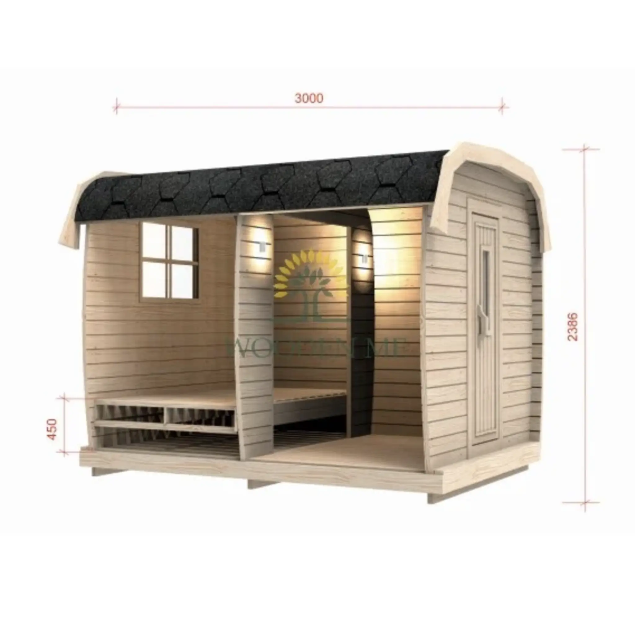 Kämpingumaja, mis on sageli valitud nende ahvatleva disaini ja lisaruumi tõttu, toodetakse männipuidust või termopuidust, mille seinad on paksusega 46 mm.