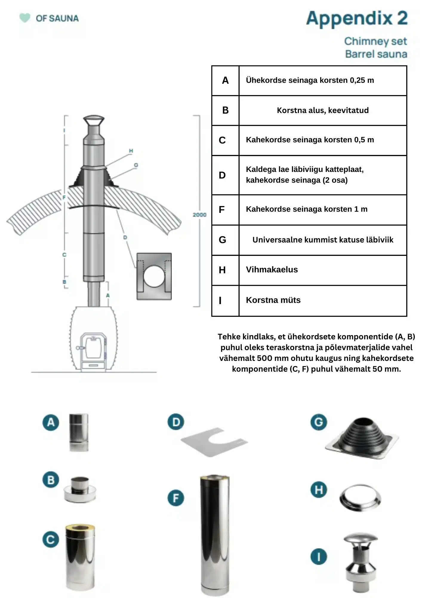 See tünnkorstna komplekt on mõeldud ulatuma otse läbi lae ja on mõeldud kasutamiseks HUUM puuküttega saunaahjudega tünnisaunades.