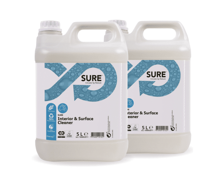 SURE Interior & Surface Cleaner on taimsetest koostisosadest kontsentreeritud universaalne puhastusvahend kõvade pindade puhastamiseks, sobib kasutamiseks põrandatel, seintel, ustel, lagedel ja üldise varustuse puhastamiseks. Ilma lõhna- ja värvaineteta sobib kasutamiseks toiduruumides ning sobib ka laudade ja klaaspindade puhastamiseks. ELi Lillekese sertifikaadiga.