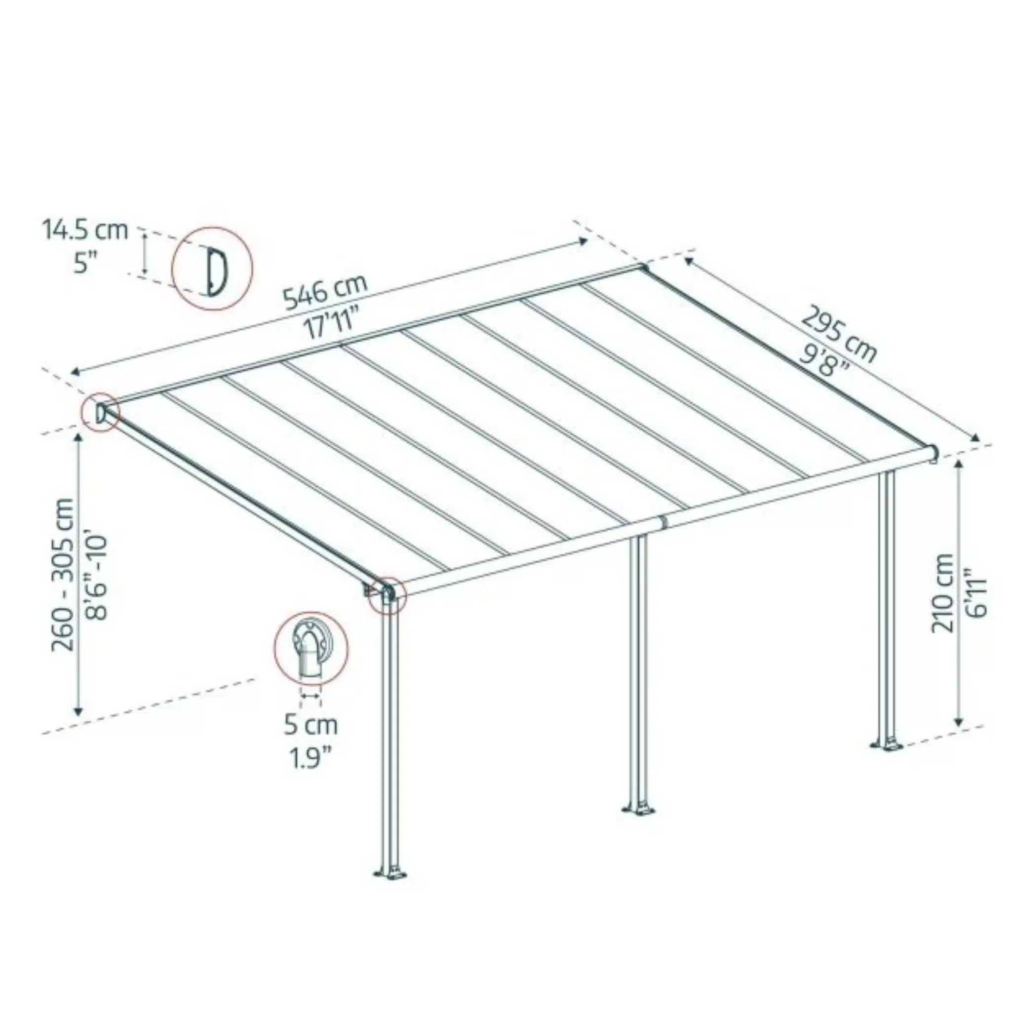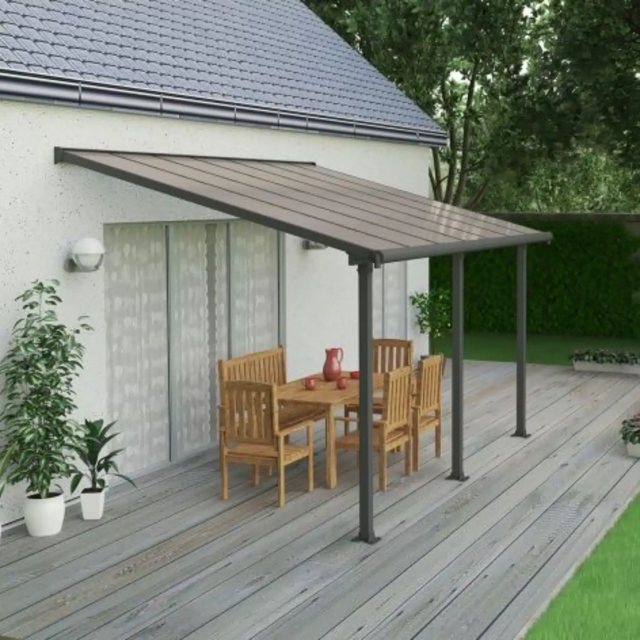 Varikatus on reguleeritava seinaühendusega ja vabalt positsioneeritavate tugevate 8×8 cm esipostidega. Tugev konstruktsioon koosneb tugevatest ja korrosioonikindlatest pulbervärvitud alumiiniumprofiilidest ja tsingitud terasest liigenditest. Tarne sisaldab ankurdus- ja jalaplaate, millega saad kinnitada terrassi varikatuse enda valitud platvormile. Integreeritud 50 mm räästasüsteem võimaldab vihmavett juhtida ja kastmissüsteemi koguda. Hooldusvaba varikatus ei roosteta, mädane ega purune.