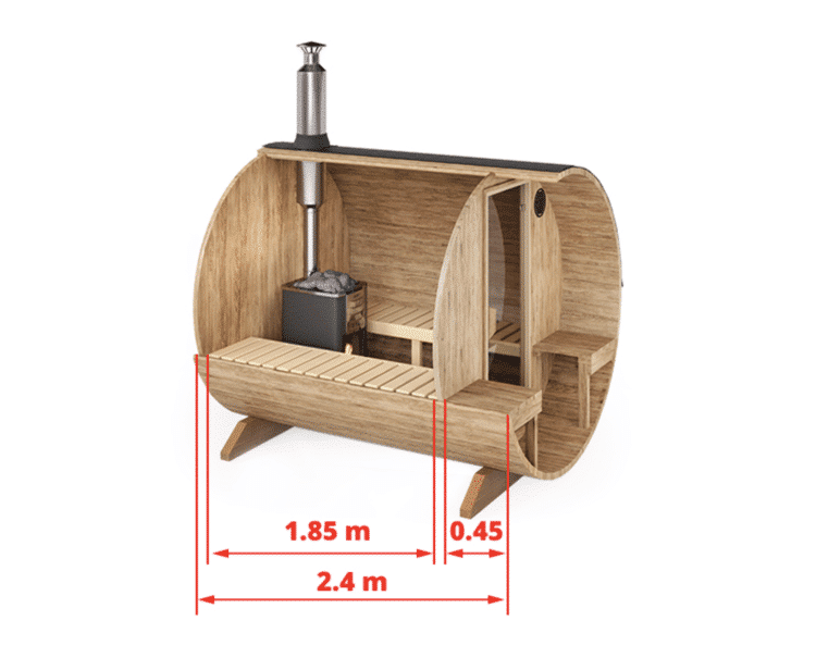 Selles tünnisaunas on hubane leiliruum 4-5 inimesele ja väike puhkeala välimiste istmete kujul. Ostes selle välissauna, saad suurepärase hinna-kvaliteedi-funktsionaalsuse tasakaalu ning täiusliku kingituse oma tervisele.