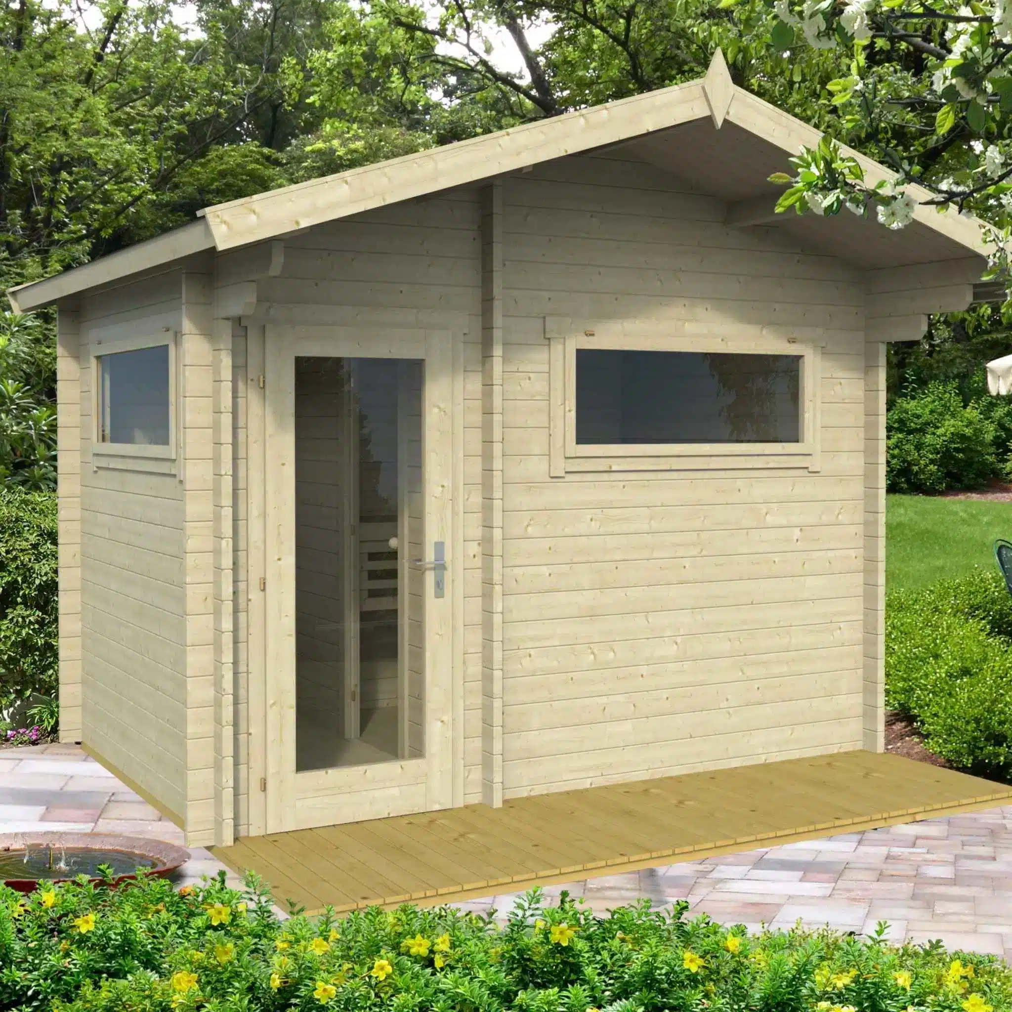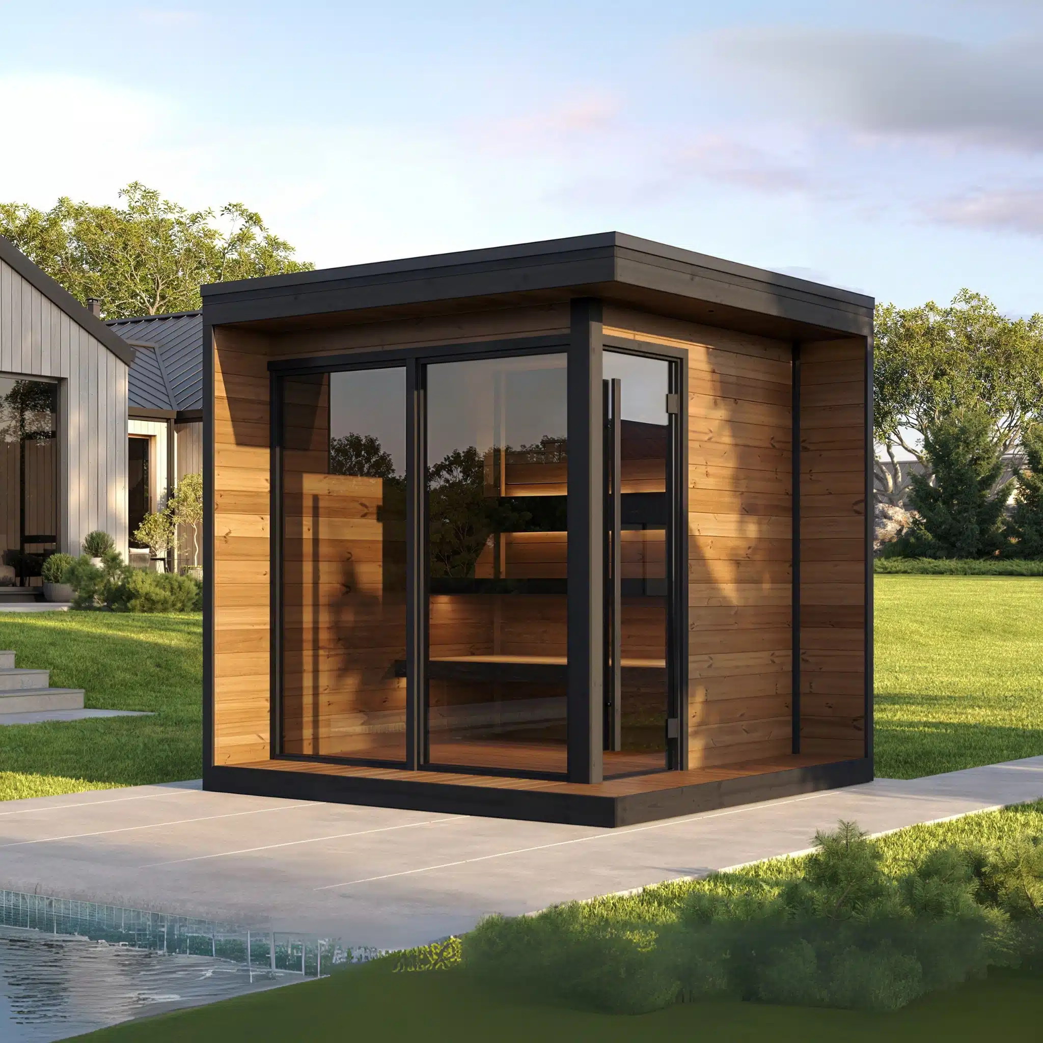 Sauna sees: Sauna pingid on valmistatud lehtpuust; Sauna uks on 819 x 2032 mm (kuusepuust) suurte karastatud klaasidega akende ja lukuga.