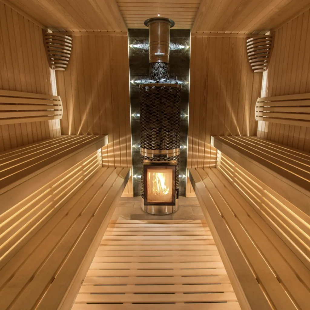 - Puulämmitteinen kiuas: tarjoaa perinteisen saunatunnelman – luonnollinen tuli, pehmeä höyry ja aito puun tuoksu.