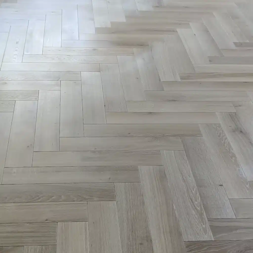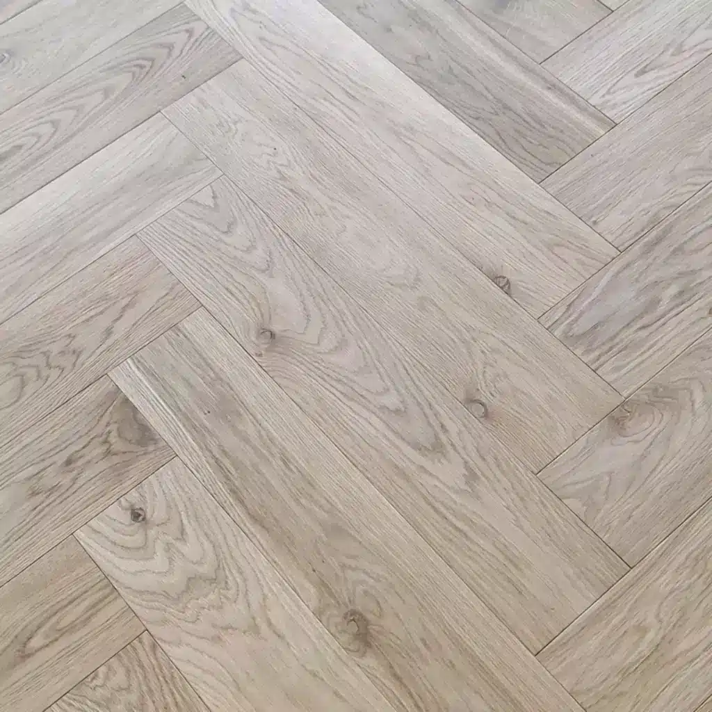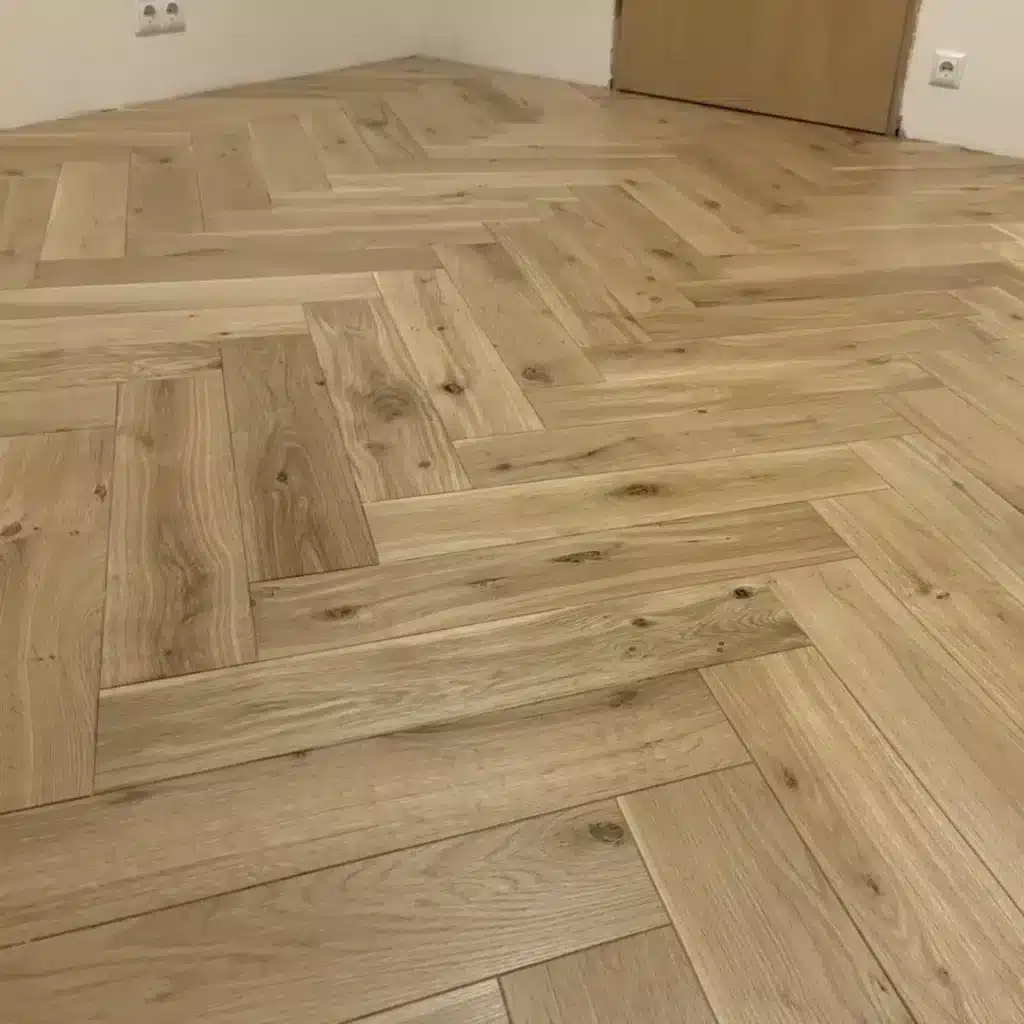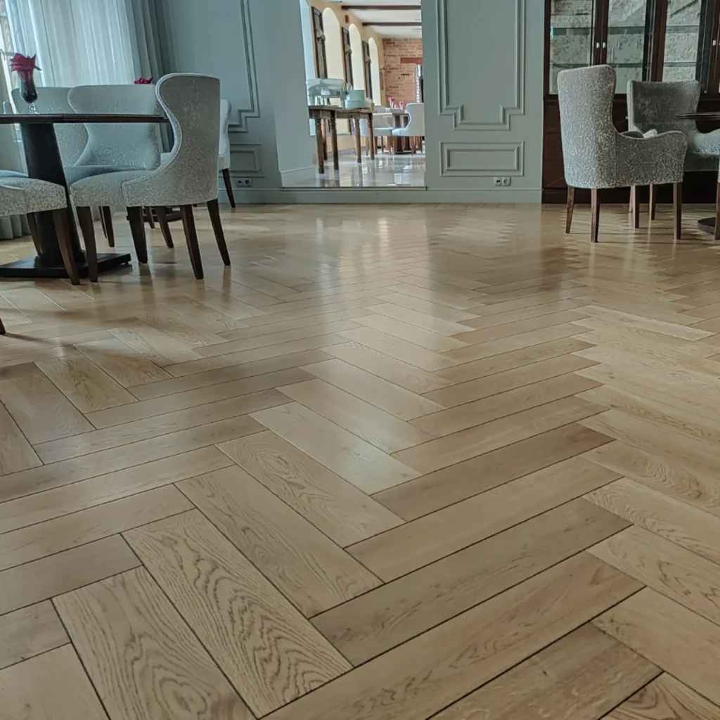 Woodengold tammi ranskalainen kalanruotoparketti chevron 45°/60° T&G obiekt (120×650 mm)