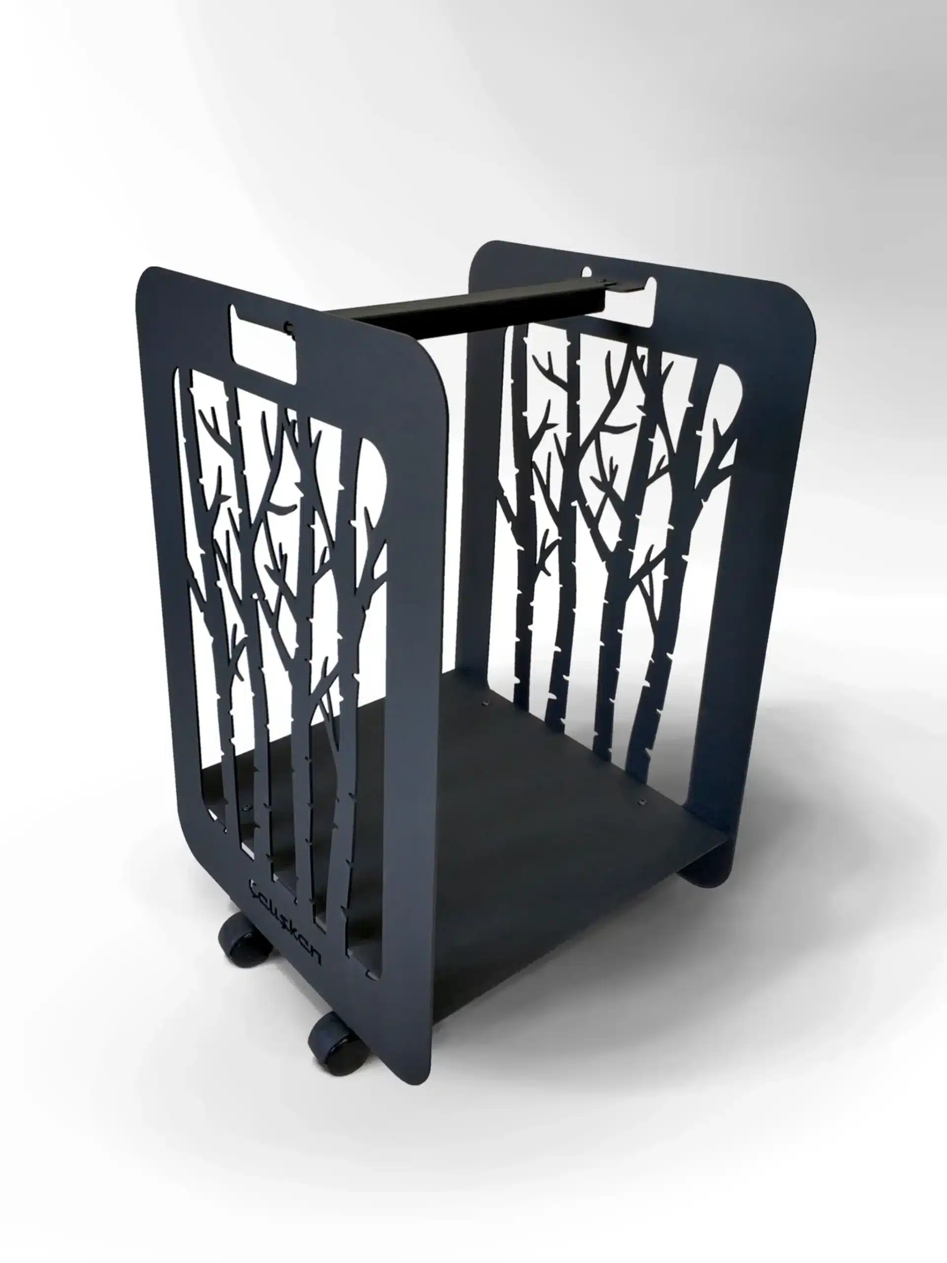 Kompakti mutta tilava rakenne tarjoaa 80 litran tilavuuden, joten siinä voi säilyttää riittävän määrän polttopuita ja pitää tilan siistinä. Pyörien ansiosta koria on helppo siirtää sinne, missä sitä tarvitaan.