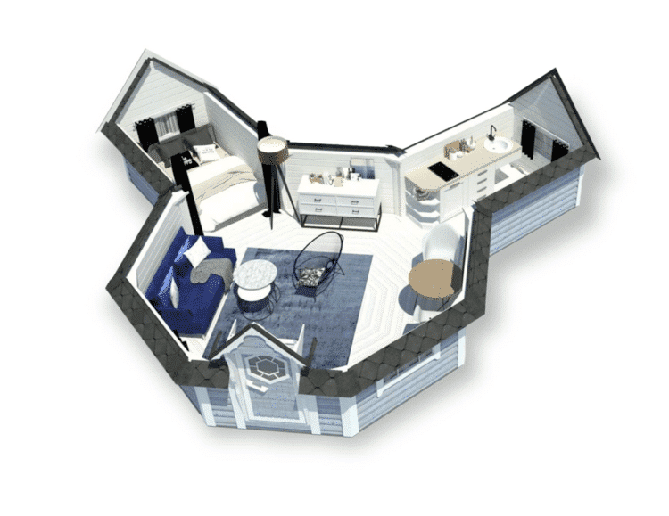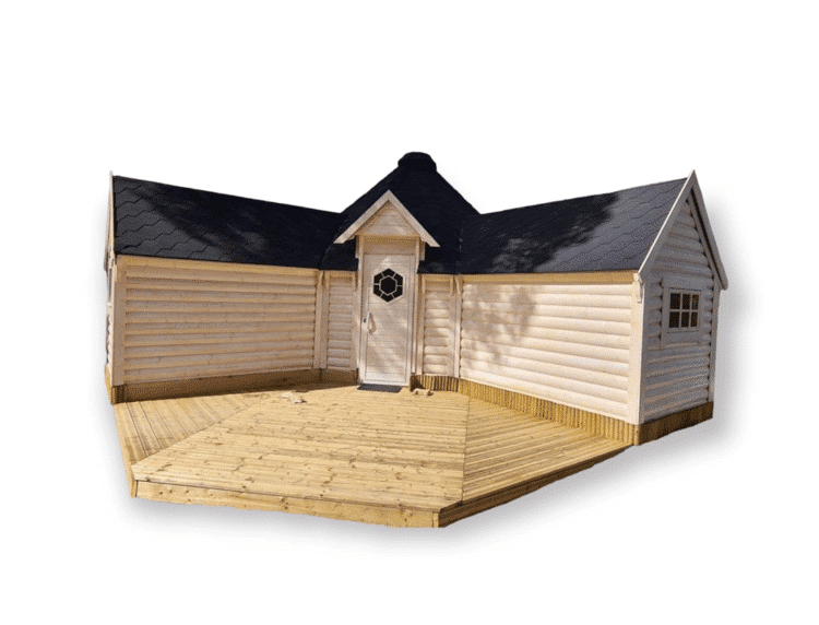 3 huonetta: kahdeksankulmainen mökki ja 2 suorakulmaista laajennusta;