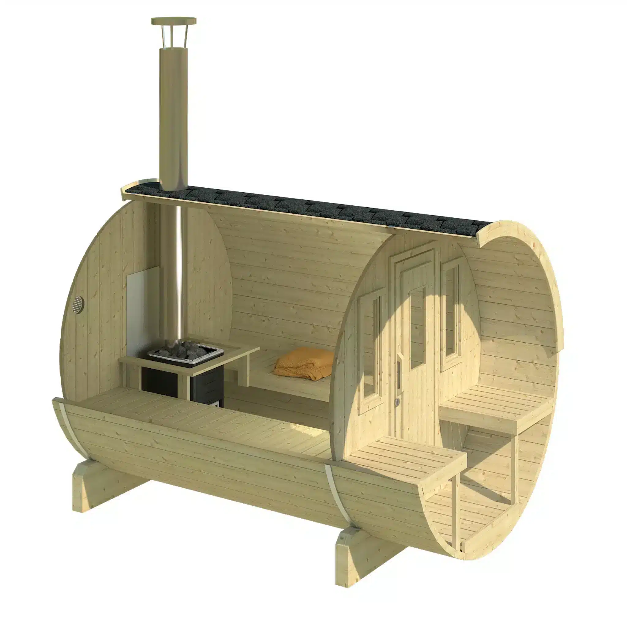 Koe rentoutuminen Ehala 280 tynnyrisaunassa – täydellinen valinta sekä yksityiseen käyttöön että ystävien kanssa saunomiseen. Tilava 2,8 metrin pituinen tynnyrisauna tarjoaa autenttisen saunaelämyksen ympäri vuoden. Korkealaatuisista materiaaleista valmistettu ja kestävällä katteella varustettu sauna sopii erinomaisesti mihin tahansa pihaympäristöön. Ulkoistuimet lisäävät käytännöllisyyttä, tarjoten mukavan paikan rentoutumiseen ennen saunomista tai sen jälkeen.