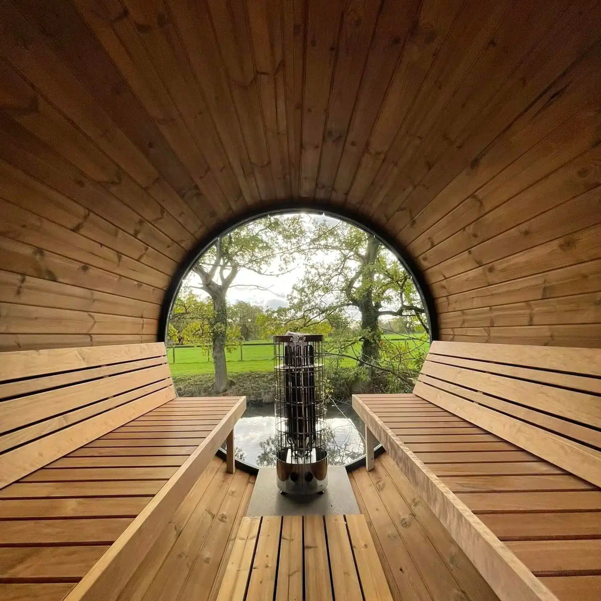 Saunan tilava sisätila sopii jopa neljälle hengelle ja tarjoaa tarpeeksi tilaa rentoutumiseen ja nautiskeluun. Harkittu muotoilu ja laadukkaasta pohjoismaisesta kuusesta valmistetut vahvat seinäpaneelit takaavat kestävyyden ja pitkän käyttöiän, tarjoten samalla erinomaisen lämmöneristyksen.