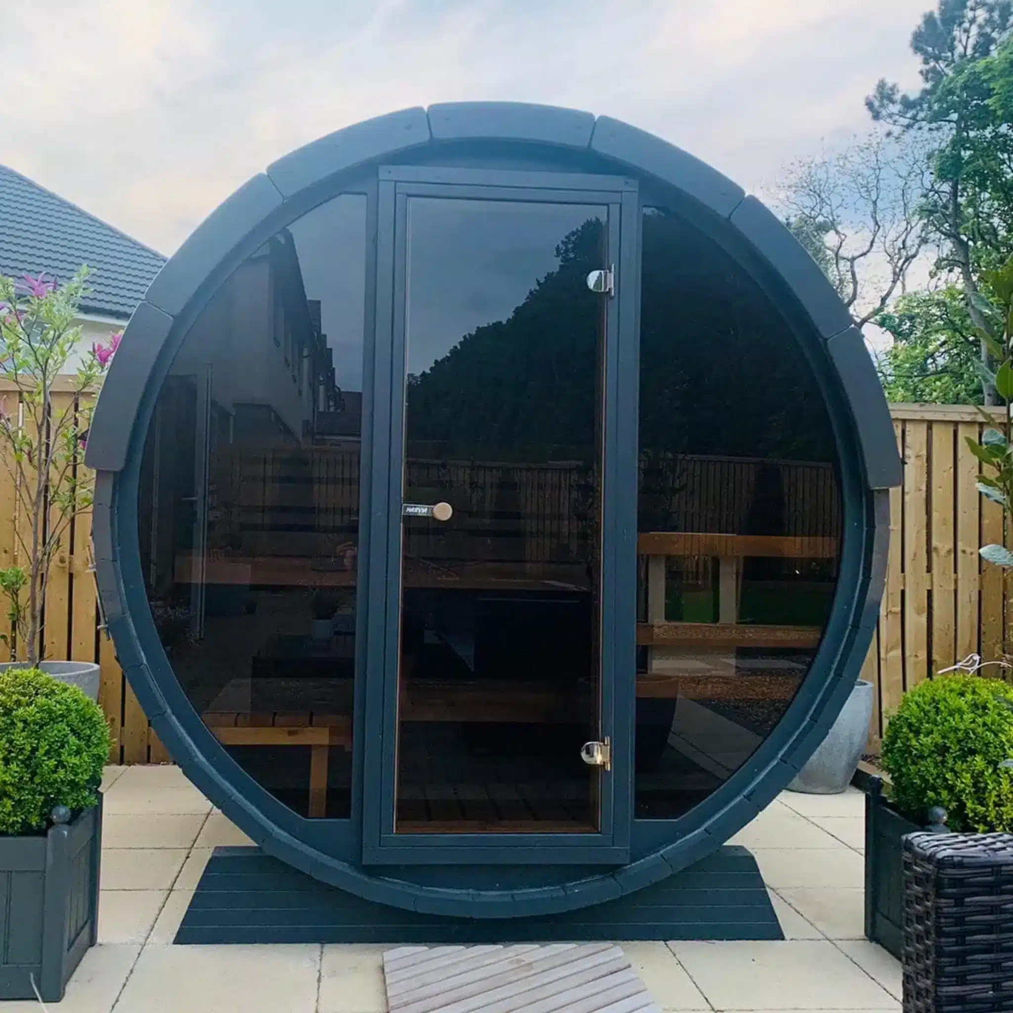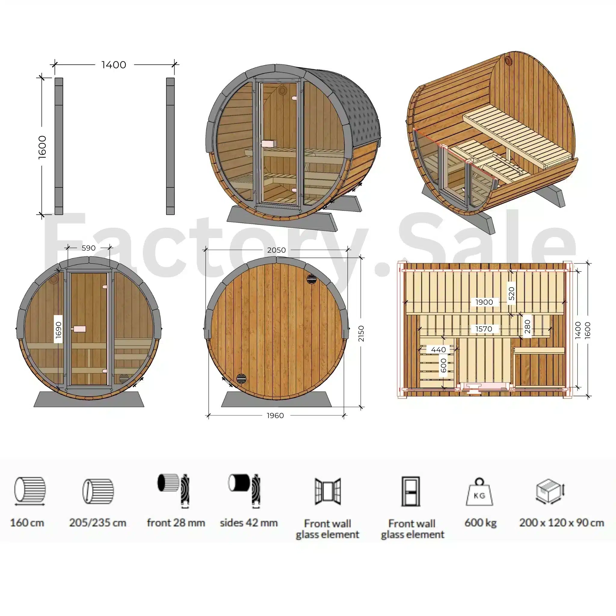 Laadukkaista materiaaleista valmistettu sauna on rakennettu kestämään erilaisia sääolosuhteita säilyttäen samalla elegantin muotoilunsa. Sen tynnyrimuoto varmistaa optimaalisen lämmön kierron luoden mukavan ja yhtenäisen saunomisen. Tämä sauna on ihanteellinen sekä yksityistä lomaa etsiville henkilöille että pienille ryhmille, jotka haluavat lisätä ylellisyyttä mihin tahansa ulkoilmaympäristöön.