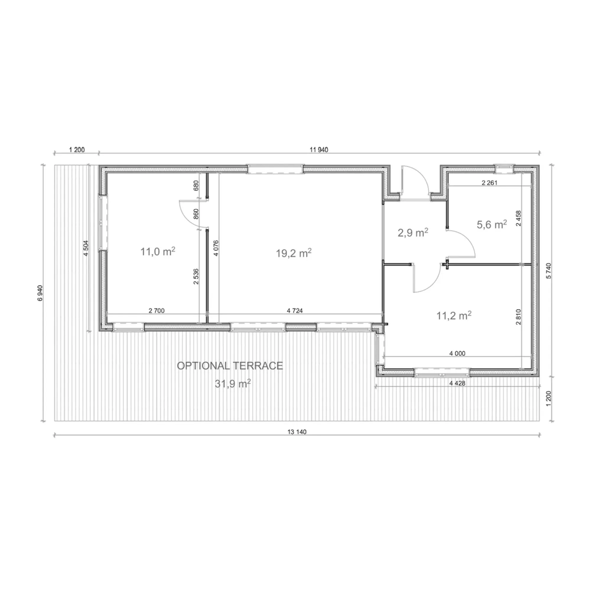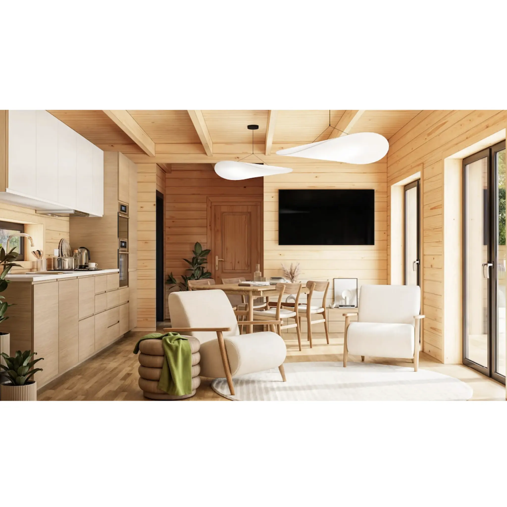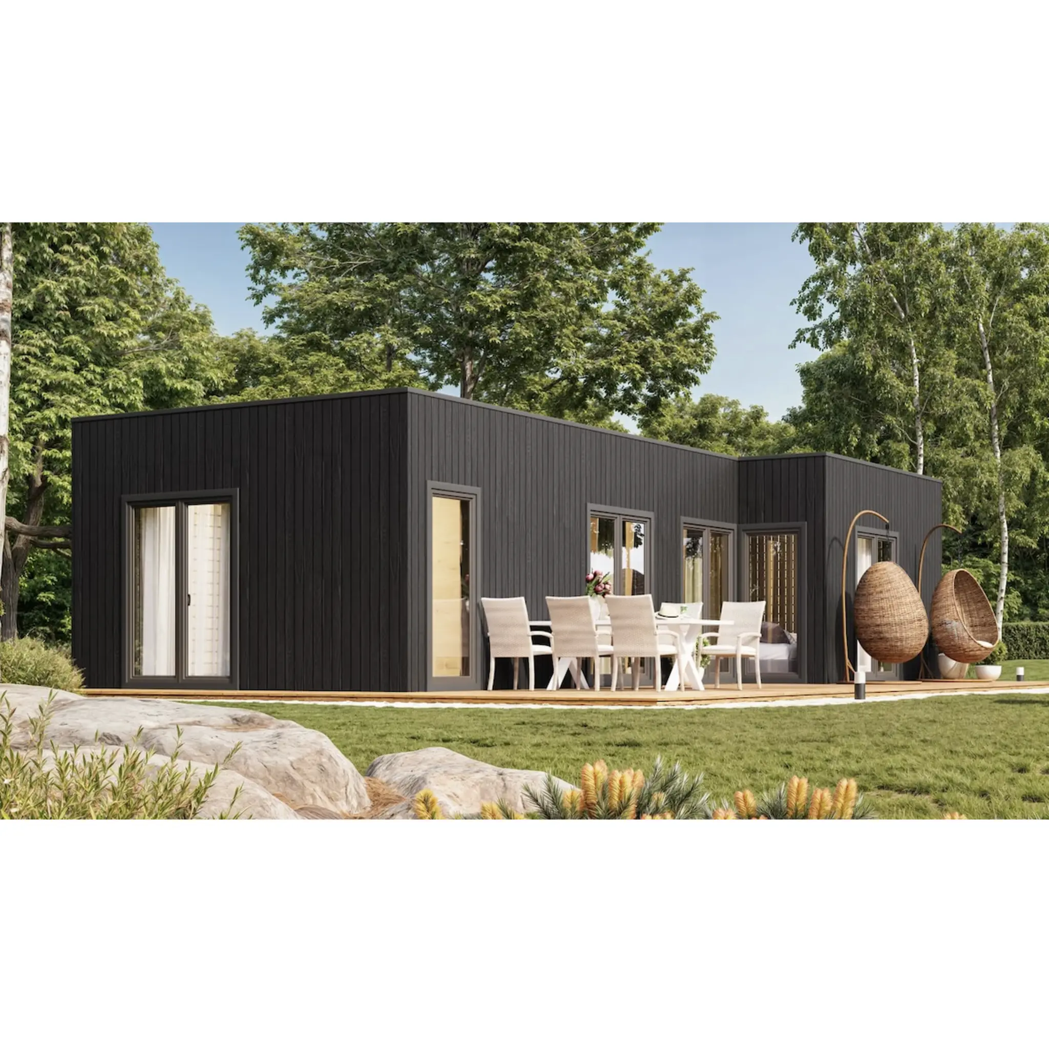 Pohjapinta-alaltaan 5,74 × 11,94 m ja sisäpinta-alaltaan yhteensä 49,9 m² kokoinen NORDIC-L tarjoaa älykkään ja toimivan pohjaratkaisun: avara olohuone avoimella keittiöllä, kaksi makuuhuonetta ja kylpyhuone. Suuret ensiluokkaiset kaksinkertaiset ikkunat sekä lasinen ulko-ovi tuovat sisätiloihin runsaasti luonnonvaloa, samalla kun kompakti 3,0 m harjakorkeus ja loiva kattokaltevuus (~6,5°) luovat modernin ja minimalistisen ilmeen.