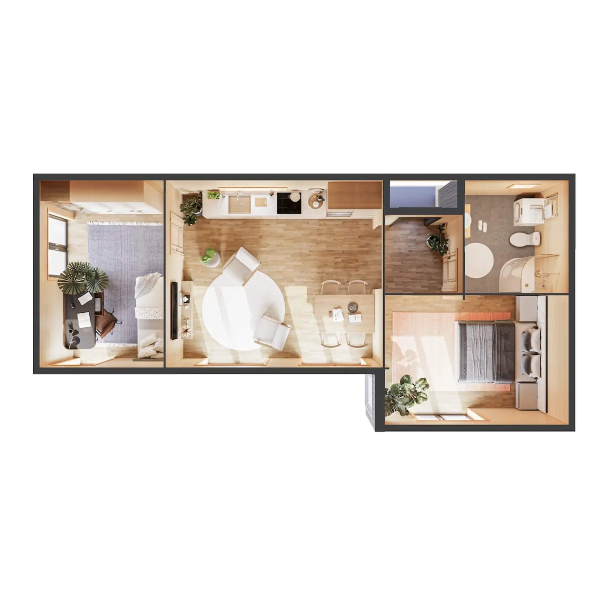 | Pohjaratkaisu | Avoin olohuone/keittiö; 2 makuuhuonetta; 1 kylpyhuone |