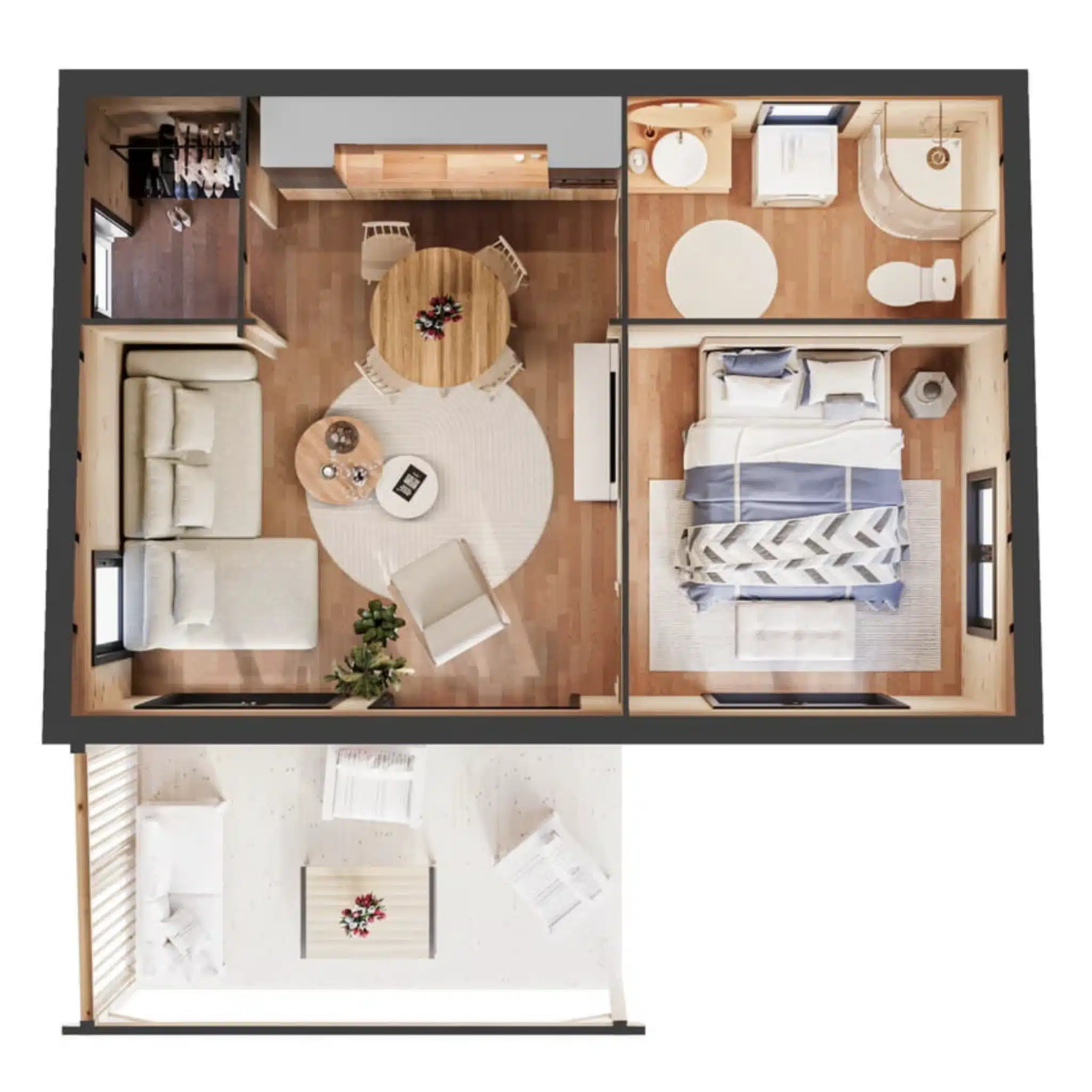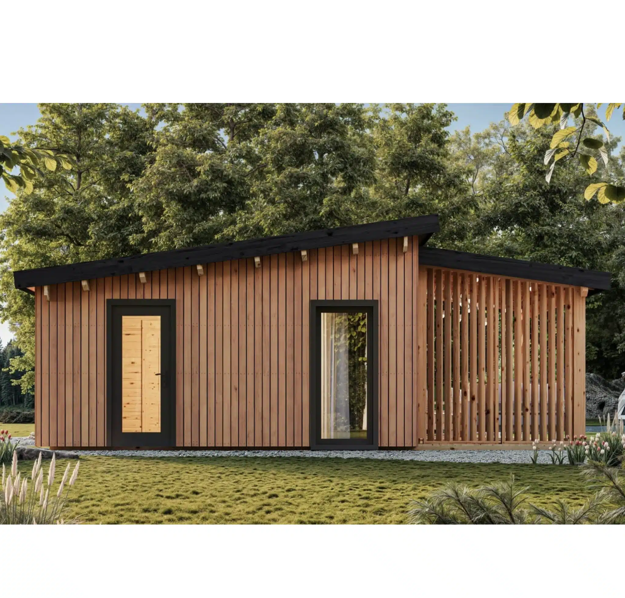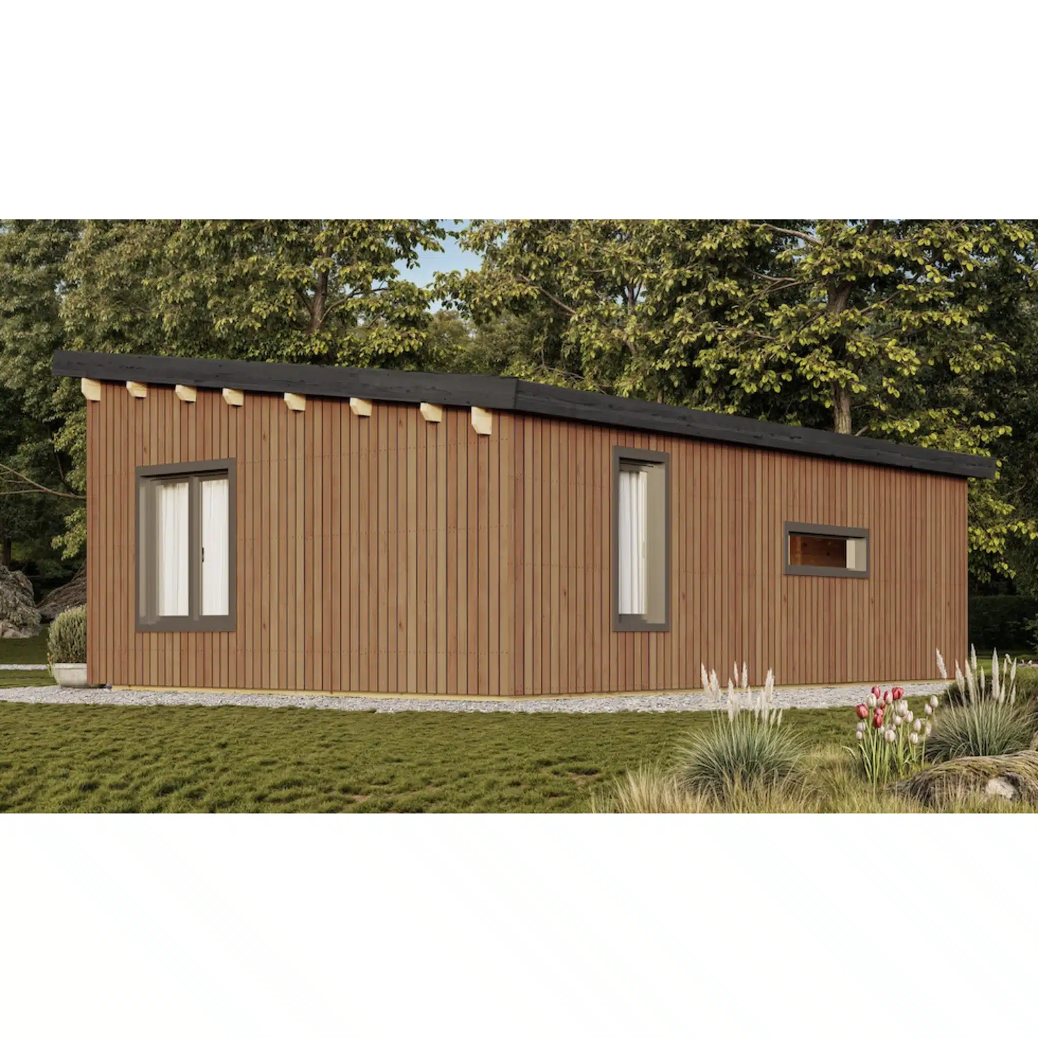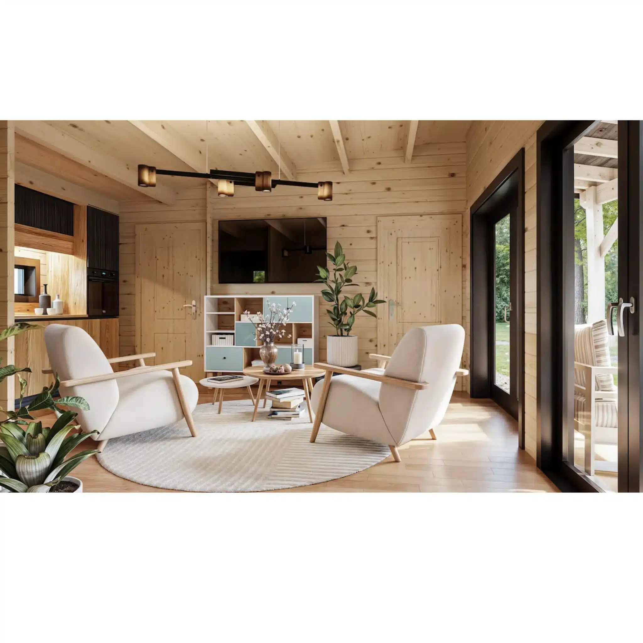 Sisätiloissa on valoisa pohjaratkaisu: olohuone 18,6 m², makuuhuone 9,2 m², monikäyttöinen huone 5,4 m², tekninen tila 2,2 m² sekä katettu terassi 11,0 m² – täydellinen ympärivuotiseen käyttöön. Seinäkorkeus on 2,65 m ja harjakorkeus 3,18 m, mikä antaa talolle modernin ilmeen, vahvan rakennuslaadun (sertifioitu pohjoismainen kuusi) sekä varman energiatehokkuuden (U-arvot: seinät ~0,30–0,35; katto ~0,23–0,28; lattia ~0,30–0,35).