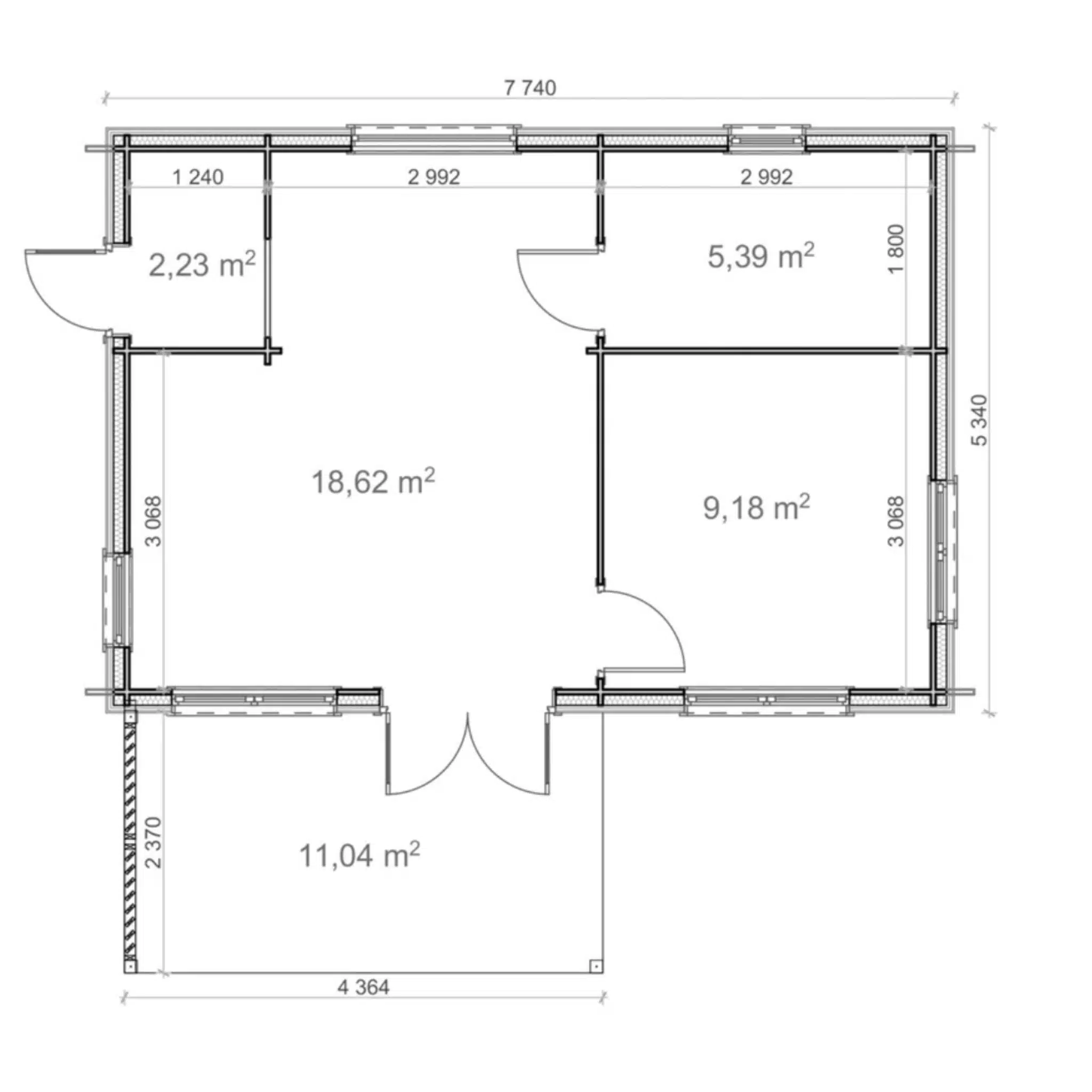 | Ulkomitat (leveys × pituus) | 7,74 × 5,34 m |