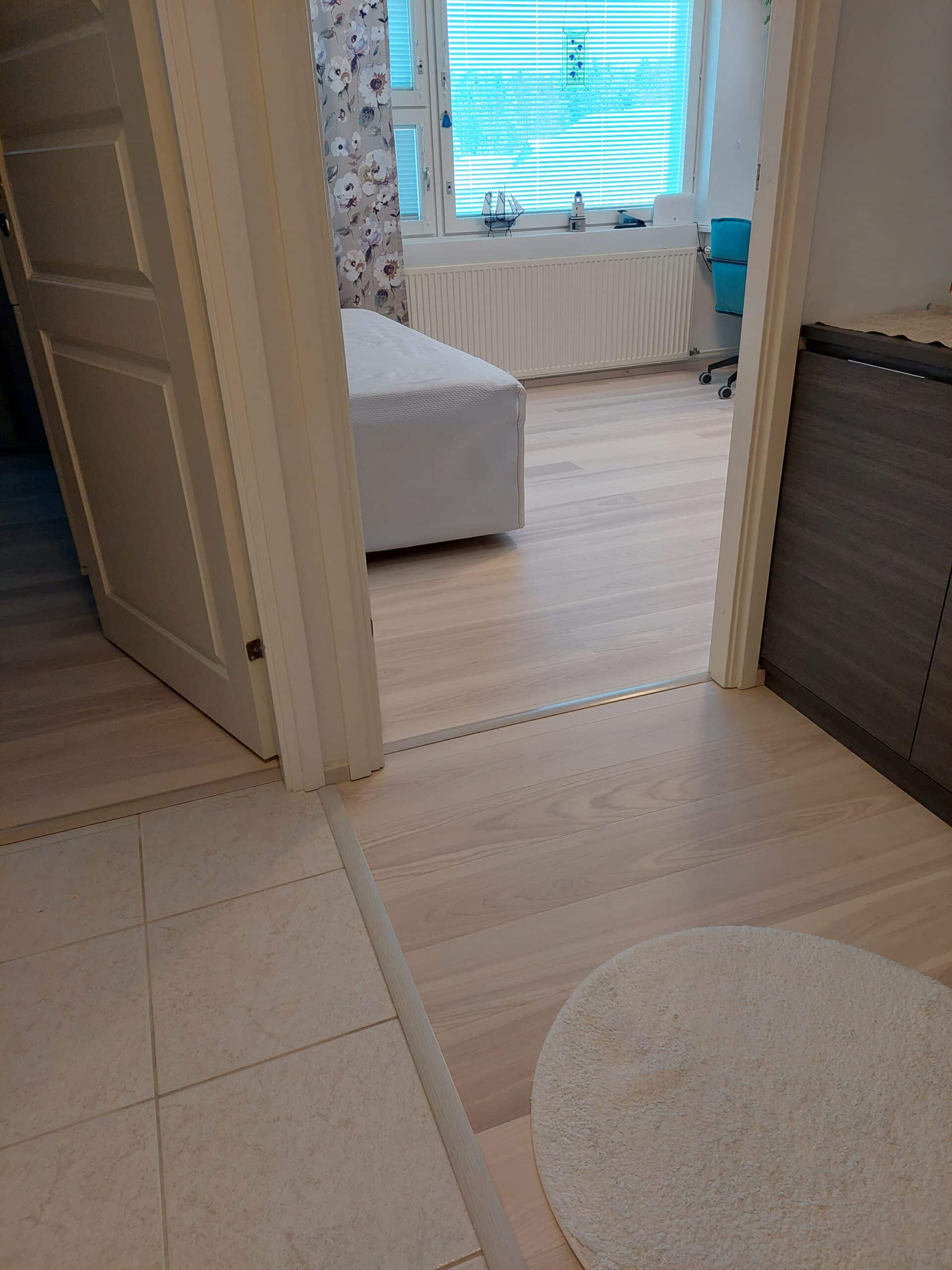 Kuljetus Suomeen toteutui loppujen lopuksi lähes kuten oli sovittu. Viikonloppu hieman sotki aikataulua, jossain vaiheessa en tiennyt, onko parkettilähetys tulossa vai ei, josta huolestuin, koska olinhan maksanut parketin ja kuljetuksen kokonaan. Hieman hankalaa ja epävarmaa oli kuljetuksen seuraaminen netissä, tässäkin asiassa Rivo auttoi. Mutta tulihan se sieltä! Parketin asentaja loksautteli parkettilaudat kiinni toisiinsa. Olemme erittäin tyytyväisiä kauniiseen pakettiin.