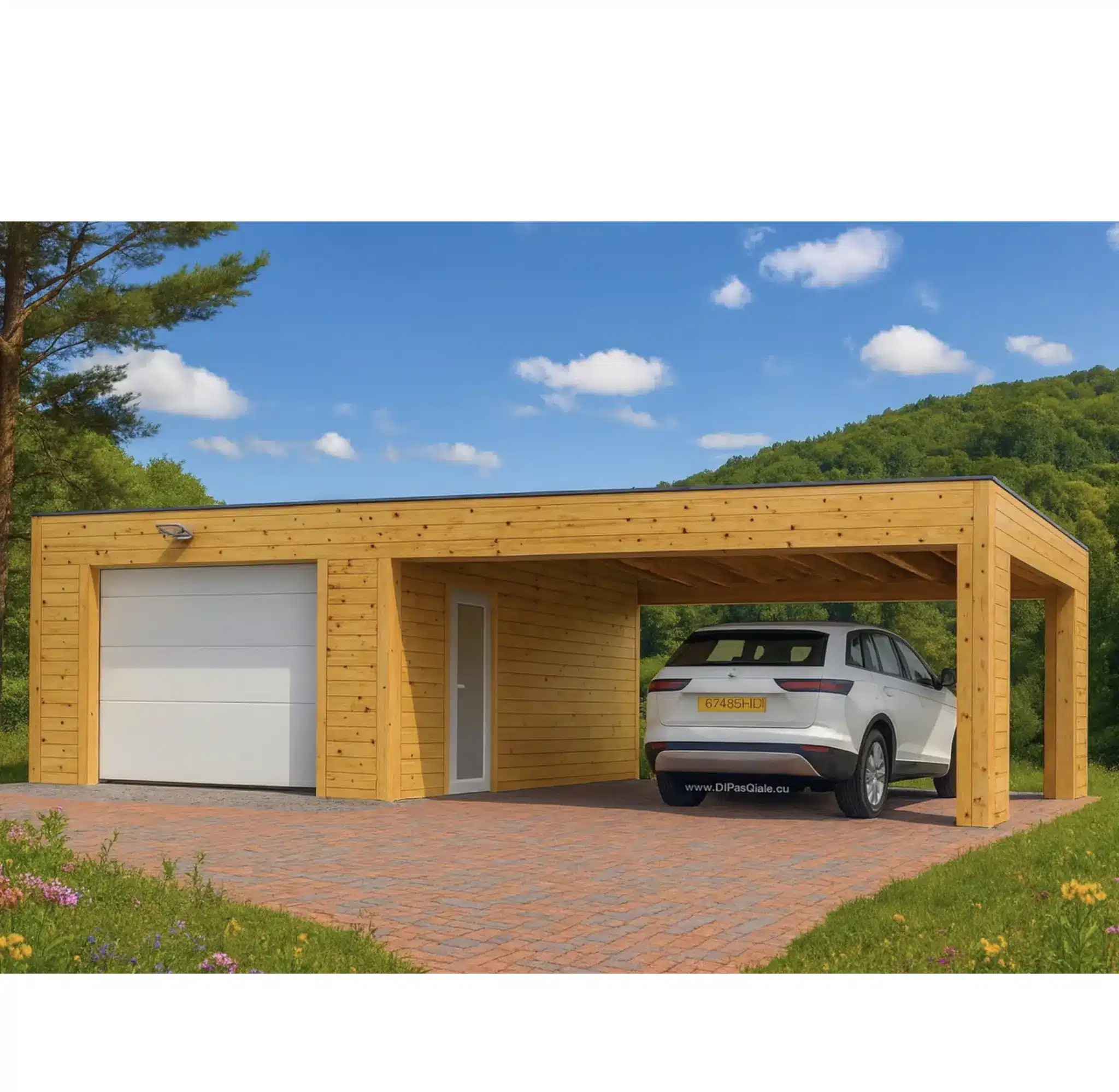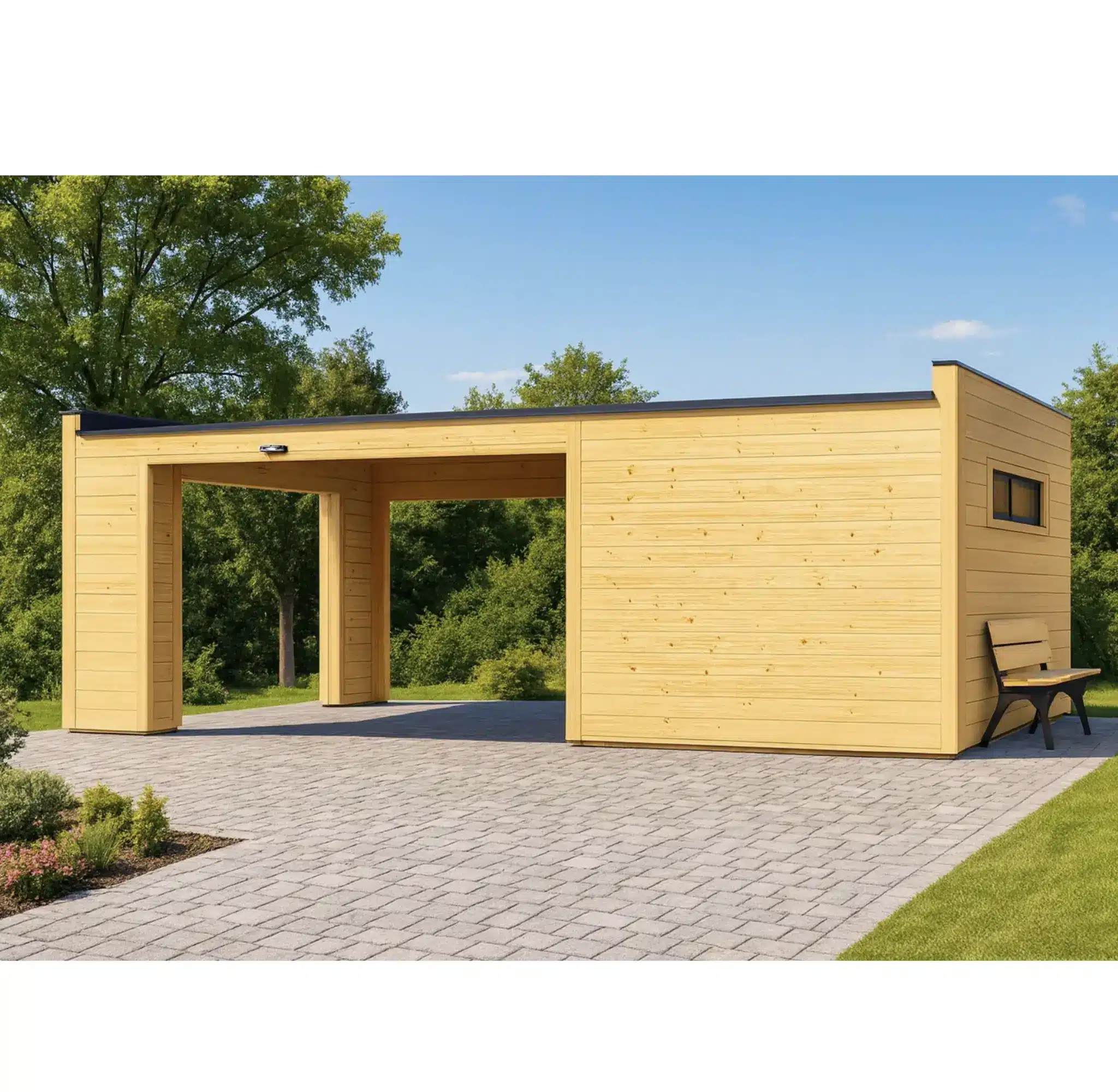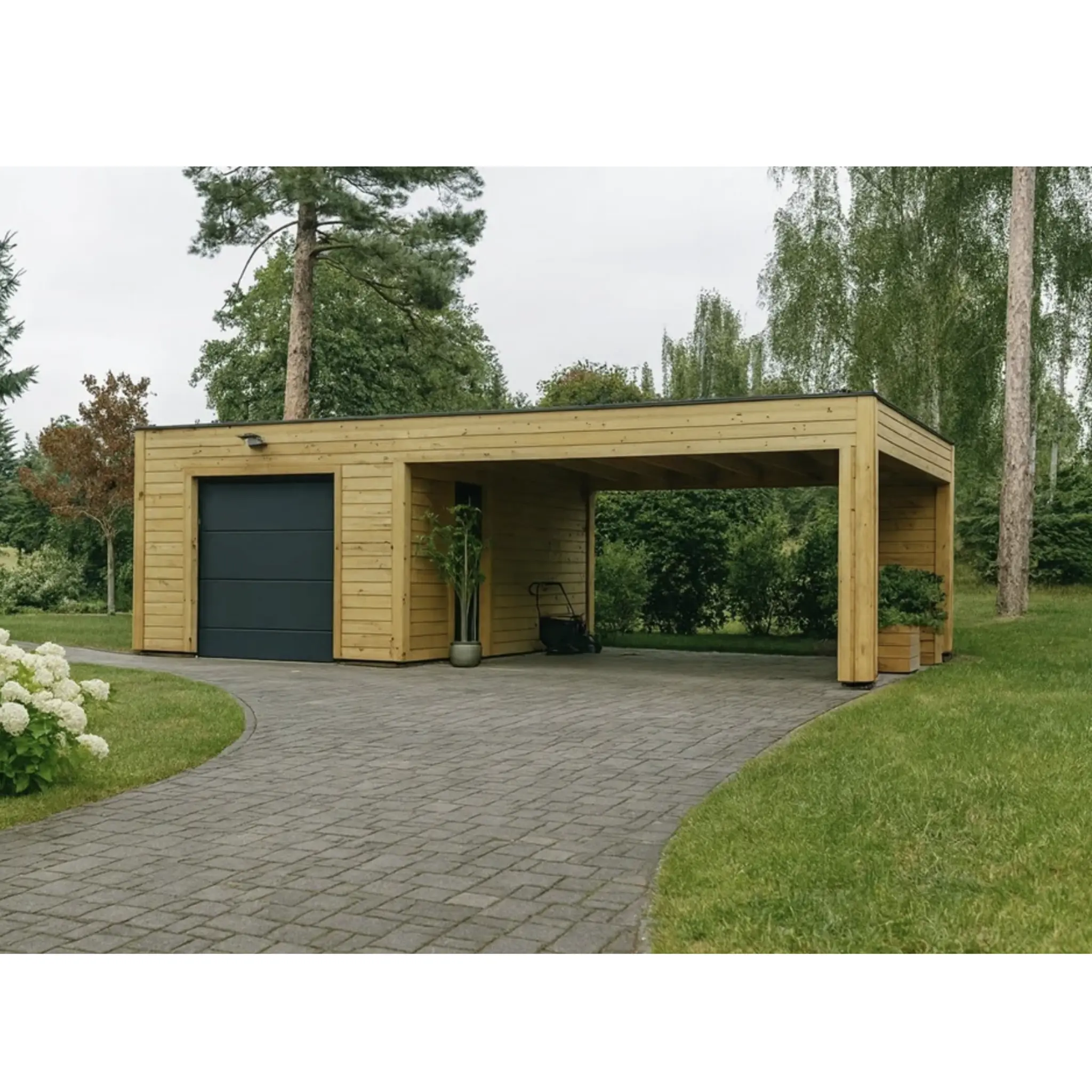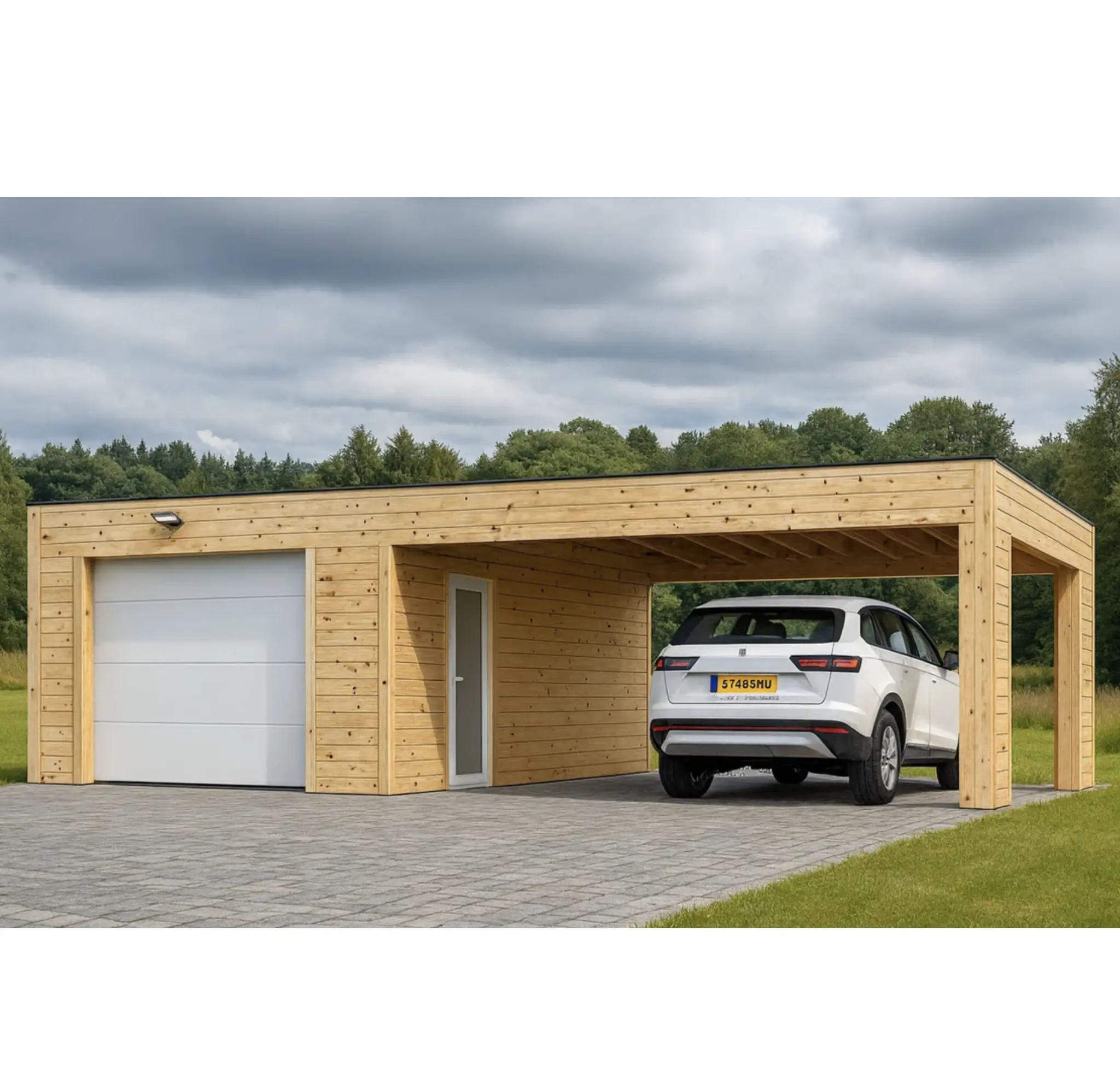 Moderni eristetty autotalli 36 m²:n autokatoksella. Ensiluokkaista pohjoismaista puuta, 44 mm + 100 mm eristetyt seinät, mukautettavat ovet ja katto. Ihanteellinen koteihin ja rakennusprojekteihin.