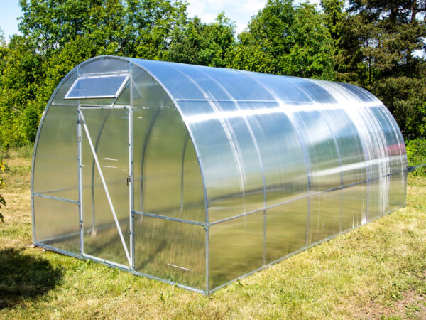 Kasvihuoneen runko on tehty vahvoista neliömäisistä putkista, jotta kokoaminen olisi mahdollisimman helppoa ja nopeaa. Kasvihuoneen ovi- ja tuuletusikkunoiden karmit ovat valmiit, eivätkä vaadi monimutkaisempaa ruuvaamista tai näpertelyä. Nosta vain eteenpäin ja kiinnitä neljällä ruuvilla. Kasvihuoneen kokoamiseen menee noin 10 tuntia. Kasvihuone on kiinnitettävä tuulta vastaan puurunkoon.