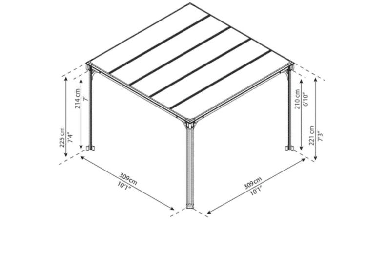 Palram-Canopia Milano 300on kestävä ja tyylikäs katos. Paviljongissa on luja, ruosteenkestävä ja antrasiitinharmaa jauhemaalattu alumiinirunko sekä sinkitystä teräksestä valmistetut liitokset. Käytännössä rikkoutumattomat, 100% UV-suojatut 6 mm polykarbonaattipaneelit suojaavat haitallisilta UV-säteiltä, sateelta ja lumelta.