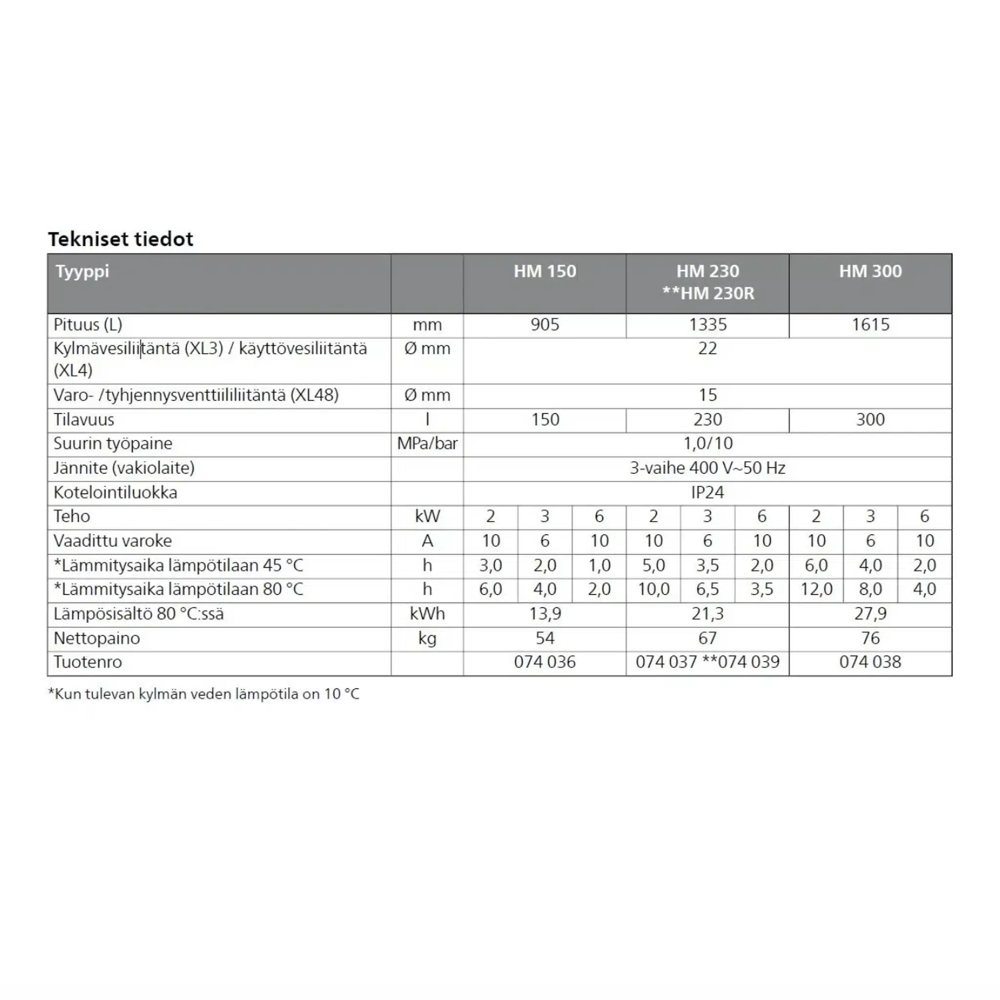 Lämminvesivaraaja asennetaan tukevan jalustansa varaan. Asennettaessa on jätettävä riittävästi tilaa (n. 500 mm) kytkentätilan eteen huoltoa varten. Laipallisen sähkövastuksen liitäntäaukko on Ø 80 mm. Vastus on helposti irrotettavissa säiliön sisäpuolista tarkastusta ja puhdistusta varten. Lämminvesivaraaja on varustettu kytkentärimalla syöttökaapelin kytkentää varten. HM-varaajan vakioteho on 3 kW 3-vaihekytkennällä. Lämminvesivaraaja voidaan kytkeä myös 230 V 1-vaihejännitteeseen, teho on silloin 2,0 kW. HUOM! Löylyhuoneeseen asennettaessa varaajan alareunan on oltava min. 100 mm ja yläreunan max. 1000 mm lattiasta. Etäisyys kiukaaseen min. 500 mm. Löylyhuoneeseen asennettaessa on myös yksivaiheisen sähköasennuksen oltava puolikiinteä tai kiinteä.