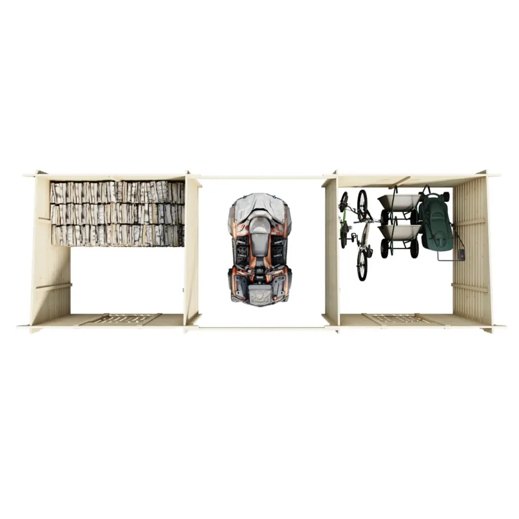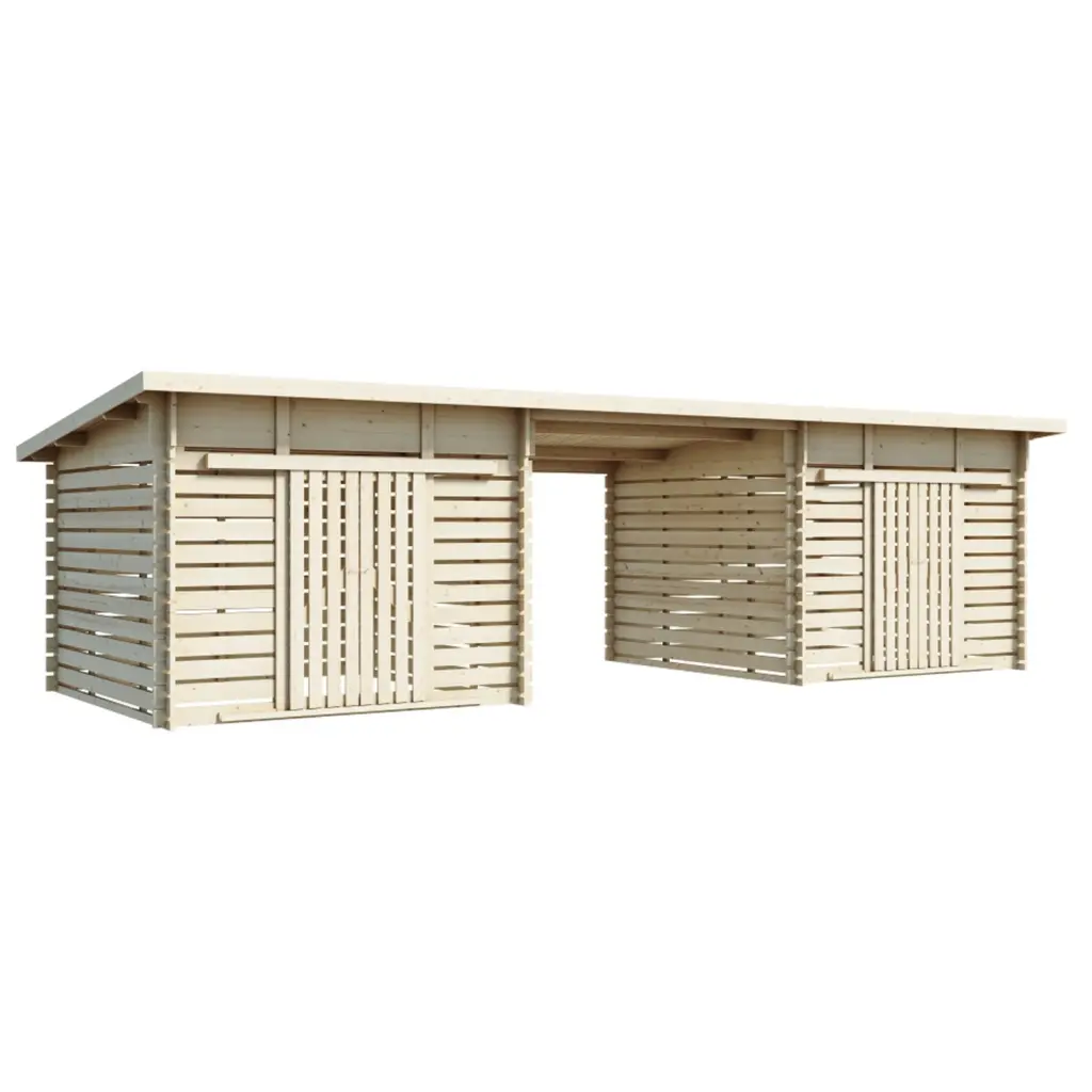 Tutustu Lillevilla Nattaset 21,70 m² kaksiosaiseen varastorakennukseen, jonka hirsipaksuus on 34 mm. Täydellinen polttopuiden ja pihan tarvikkeiden säilytykseen, sisältäen kaksi avaraa osiota ja monikäyttöisen katoksen. Helppo koota valmiiksi leikatuista osista ja muokattavissa tarpeidesi mukaan. Hanki omasi jo tänään!