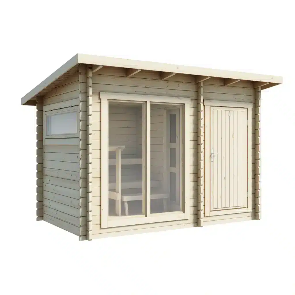 Koe Lillevilla Kallavesi -kompakti sauna – 6,6 m² laadukas sauna, jossa on erillinen pukuhuone, suuret maisemaikkunat ja kestävät 44 mm hirsiseinät. Helppo asentaa, muokattavat lisävarusteet ja täydellinen rentouttaviin saunahetkiin kotona. Tilaa nyt!