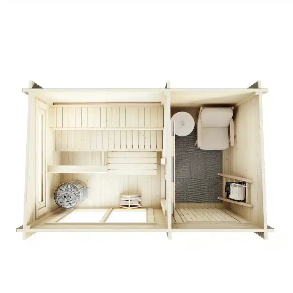 Tuotepakettiin kuuluvat hirsien, ovien ja ikkunan sekä lattia- ja kattolautojen lisäksi helat, naulat ja ruuvit. Saunahuoneen ovi on kätevä, tilaa säästävä liukuovi. Lattialautojen paksuus on 21 mm ja kattolautojen 19 mm. Toimitus sisältää myös 16 mm sisäkattolaudat saunahuoneeseen.