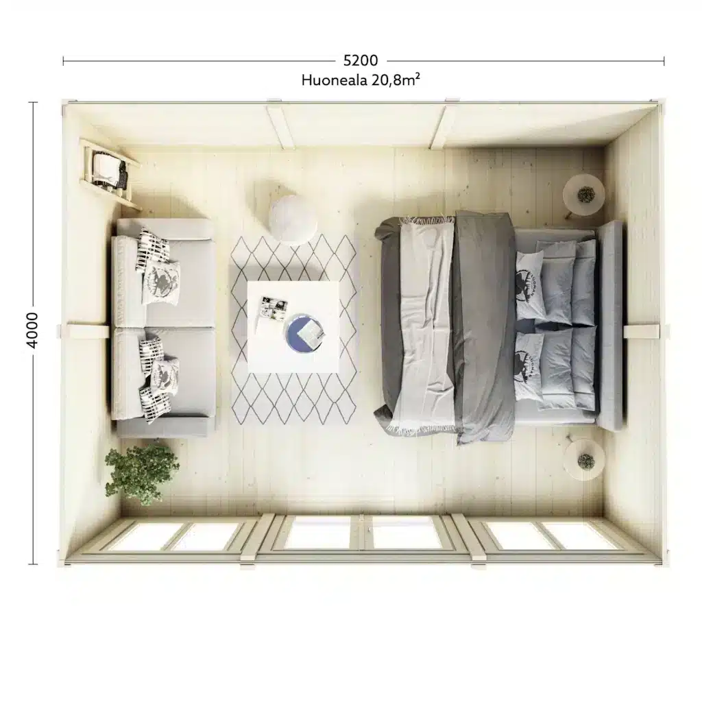 Pohjan ala tässä mallissa on reilut 20,8 neliömetriä leveyden ollessa 5,2 m ja syvyyden 4 m. Vierasmajan Lillevilla Vuoksin harjakorkeus on 245 cm. Katon ala vierasmajassa on 24,6 neliömetriä.