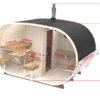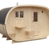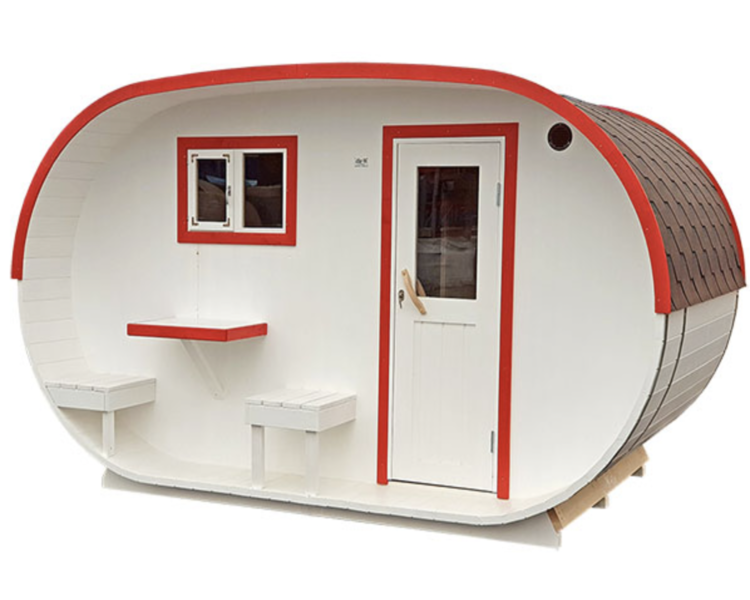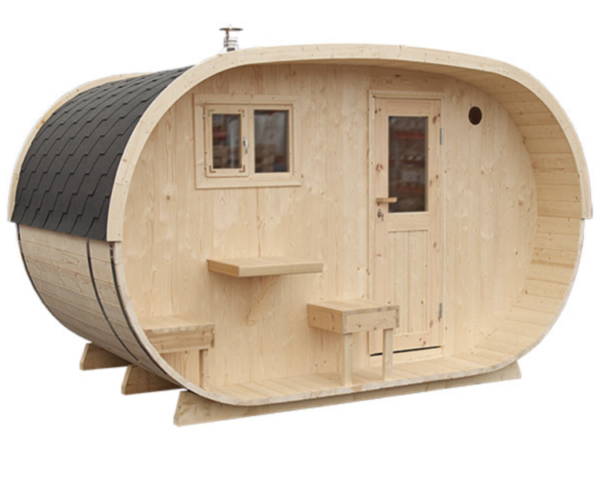Ovaali sauna on täydellinen yhdistelmä tyyliä, käytännöllisyyttä ja yksityiskohtien järkevyyttä. Tässä ovaalin tynnyrisaunan mallissa on tilava löylyhuone, jossa on lauteita kahdella tasolla, joten jokainen saunoja voi valita itselle mieluisan löylypaikan. Löylyhuoneeseen pääsee hyvin luonnonvaloa etupuolen ikkunoiden kautta. Tämän pienen pihasaunan sisäosassa on iso pukuhuone, jossa on pöytä ja penkki, joten voit vaihtaa vaatteita tai muuten vain rentoutua löylyhuoneen antimien tai huonon sään jäljiltä. Ovaalisaunan ulkopuolella on mukavat istuimet ja pieni pöytä, jossa voi vilvoitella ja nauttia raikkaasta ulkoilmasta. Sauna saatavilla vain kasaamattomana.