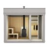 1 kpl puutarhakuutiorunko kuusesta 3 x 3 m; Kattolevyt itsekiinnittyvällä bitumikalvolla; 6 vakio täyspaneeliseinää; 7 eristettyä täyspaneeliseinää; 1 eristetty seinä, jossa on seurantalasinen ovi saunaan; 1 eristetty täyspaneeliseinä, jossa on suorakulmainen ikkuna; Kaikki kattolevyt on eristetty; 2 saunaistuinta lehtikuusesta; 4 tilaa sisällä: sauna (2 x 2 m); eteinen (1 x 2 m); vaatehuone (1 x 1 m); suihkuhuone (1 x 2 m); Kuumuutta kestävät laatat kiukaalle; 1 sisäinen lasiovi saunaan; 1 kpl vaatehuoneen ovi; 1 kpl suihkuhuoneen ovi; 1 kpl puiset ovi, joissa on tummennettu lasi (819 x 2032 mm).