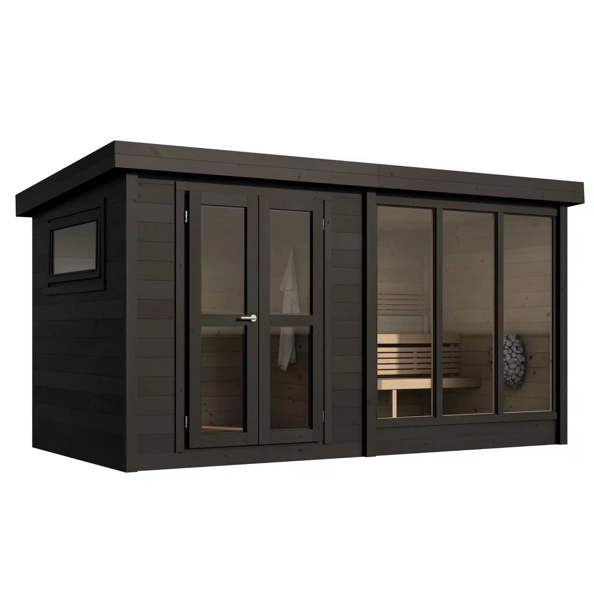 Tuulikki-sauna pukuhuoneella on moderni ja käytännöllinen valinta puutarhaan tai pihalle. Korkealaatuisesta pohjoismaisesta kuusesta valmistettu sauna tarjoaa rentouttavan ja miellyttävän ympäristön saunan ystäville. Tilava sisätila sisältää erillisen pukuhuoneen, joka tuo lisämukavuutta ja yksityisyyttä. Suuret 6 mm karkaistut lasi-ikkunat päästävät luonnonvaloa sisään, säilyttäen samalla saunan lämpimän tunnelman.  Moderni tasakattoinen muotoilu viimeistelee saunan elegantin ulkonäön.