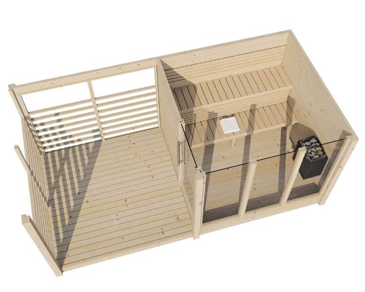 Astu täydelliseen ulkoilmakeitaaseen huolellisesti suunnitellussa saunassamme, joka sulautuu saumattomasti ympäröivään luontoon tarjoten samalla kaipaamaasi lämpöä ja mukavuutta. Terassilla varustettu sauna sopii erinomaisesti puutarhaan, takapihalle tai muuhun ulkotilaan, tarjoten sekä rentouttavan hyvinvointitilan että viihtyisän ulkoalueen, jossa voit rentoutua ennen saunaa tai saunan jälkeen.
