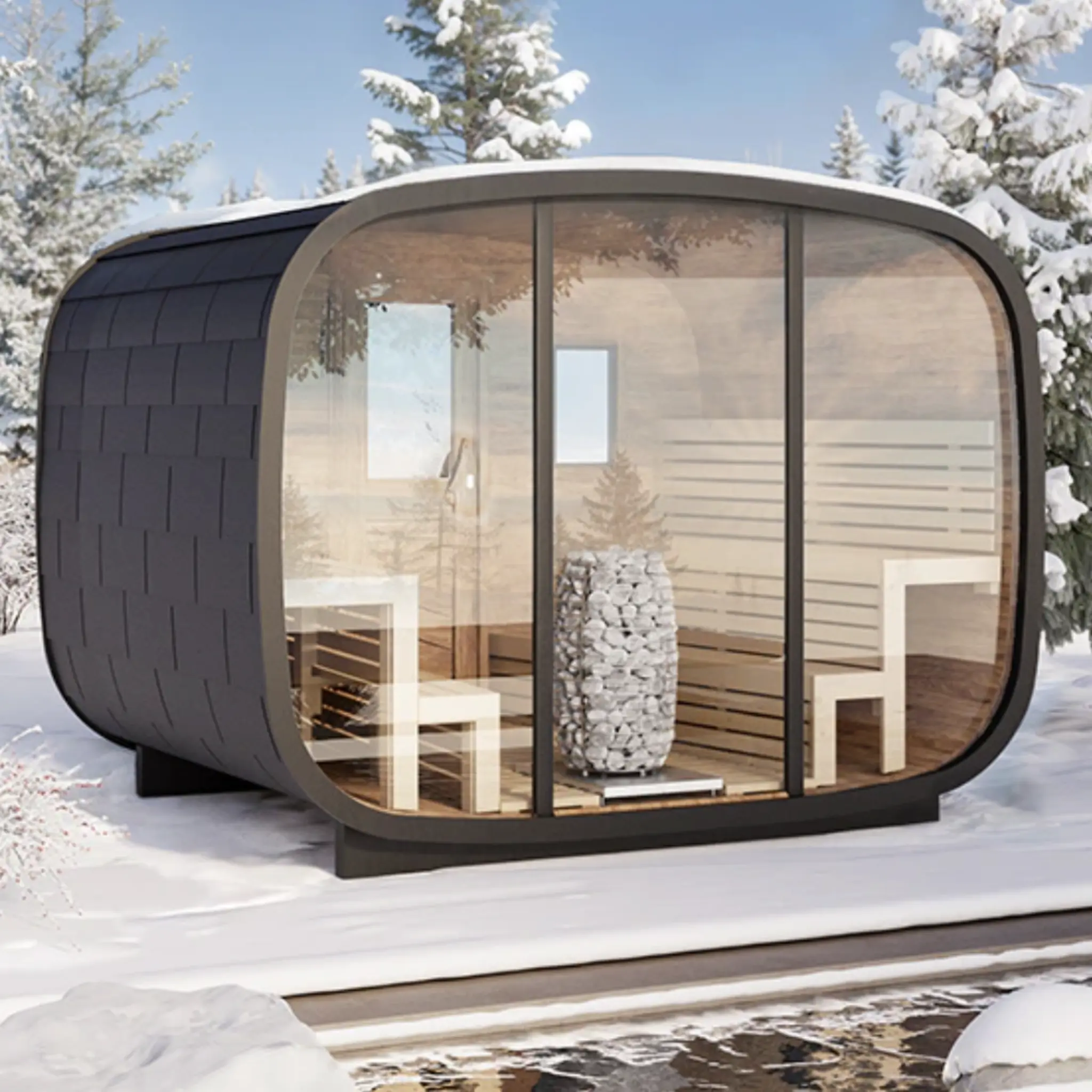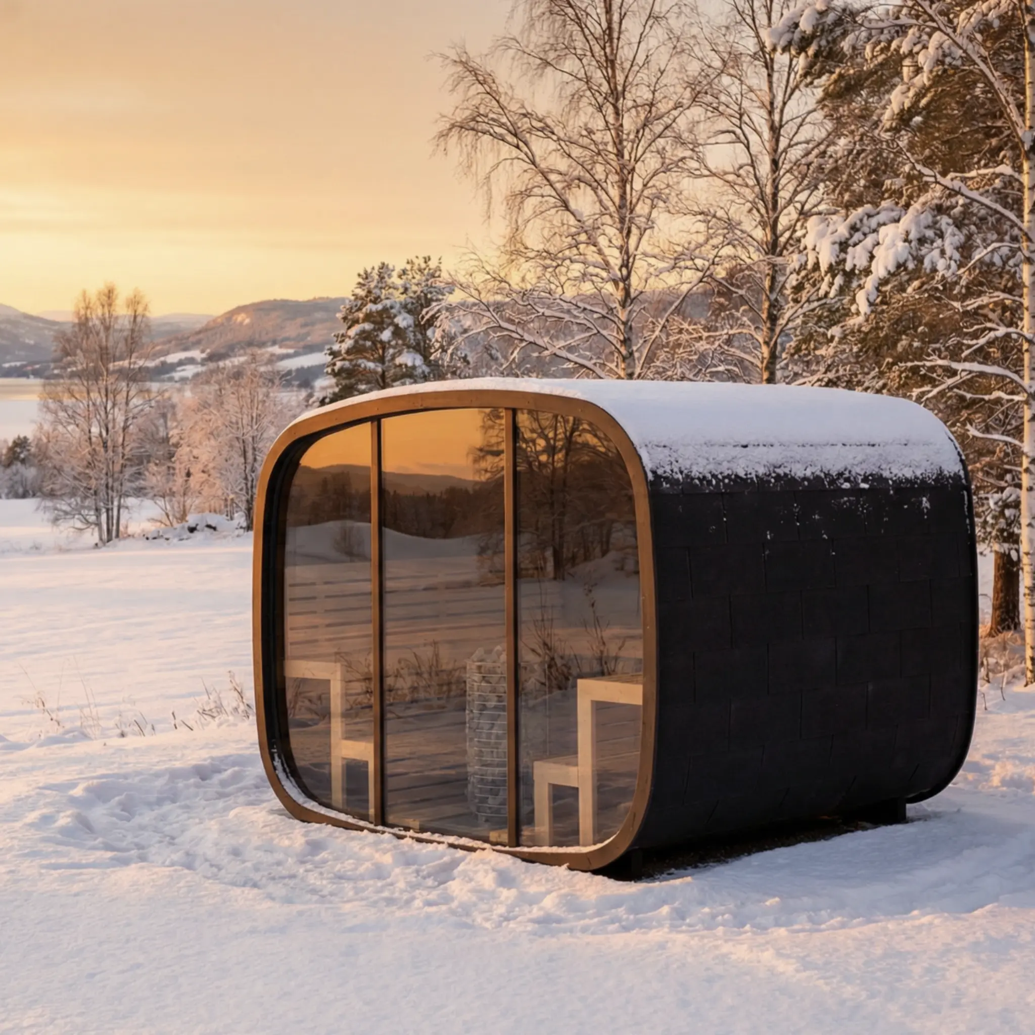 Pakene täydelliseen rauhaan Vision-saunan avulla, jonka kaareva panoraamalasietuosa yhdistää sisätilan lämmön upeisiin ulkonäkymiin. Olipa näkymänä lumiset laaksot, rauhalliset järvet tai kultaiset auringonlaskut, Vision muuttaa jokaisen saunahetken rauhoittavaksi ja palauttavaksi yhteydeksi luontoon.