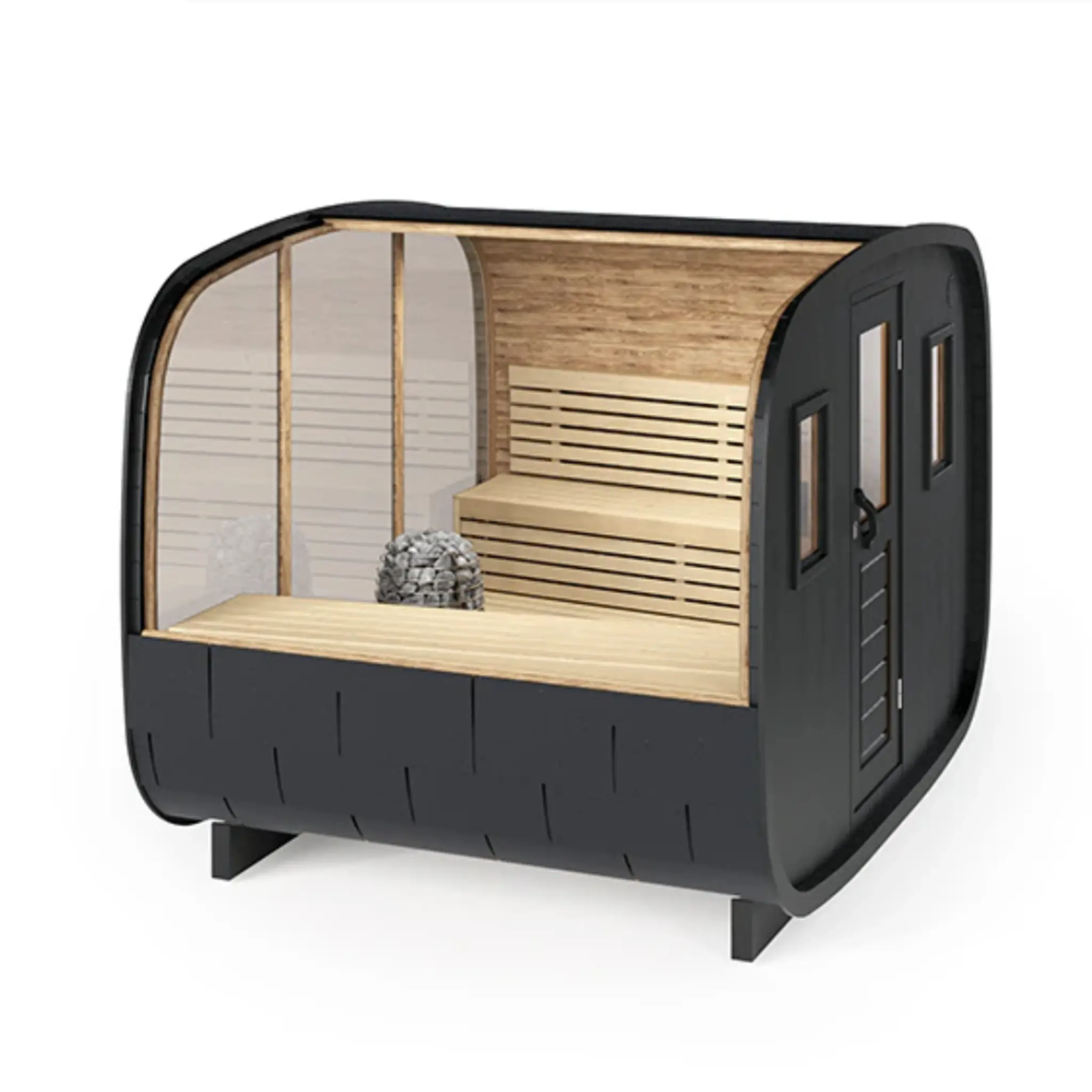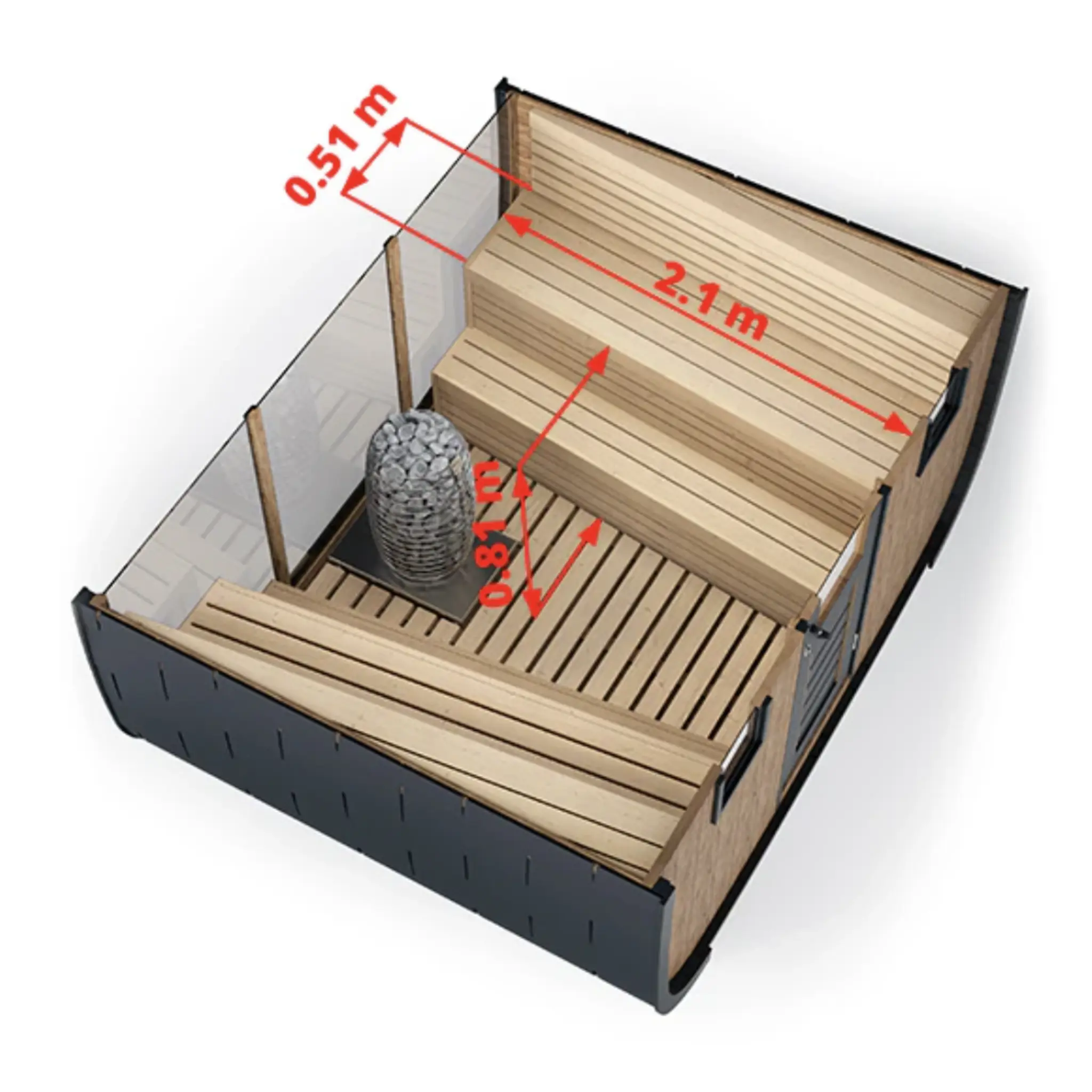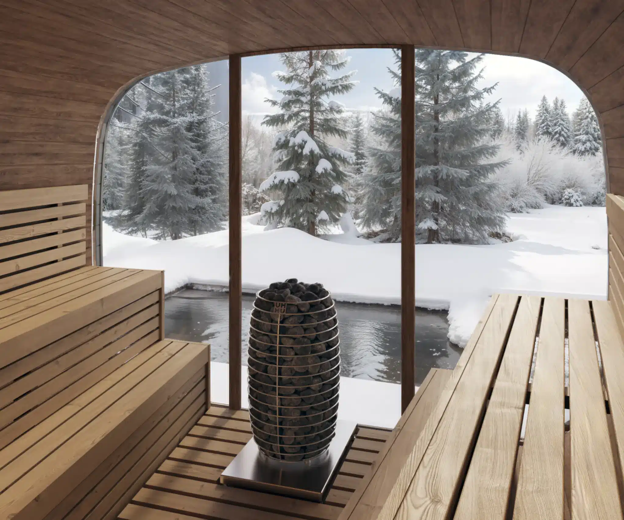 Kaareva sisätila, sileät pinnat ja tehokas lämmönkierto luovat tasaisen lämmön sekä avaran tunnelman, jolloin voit antautua syvään ja palauttavaan rentoutumiseen ilman kompromisseja.