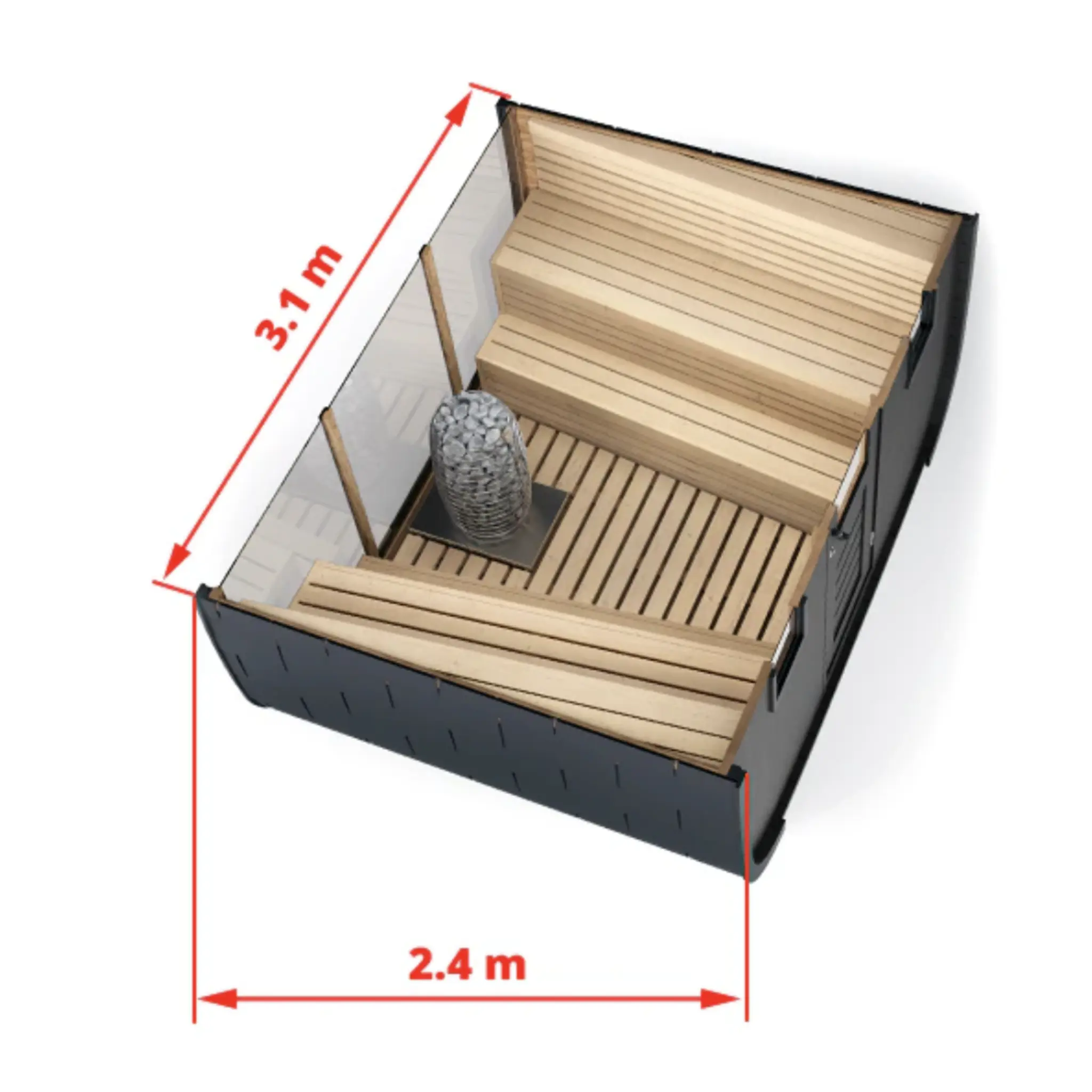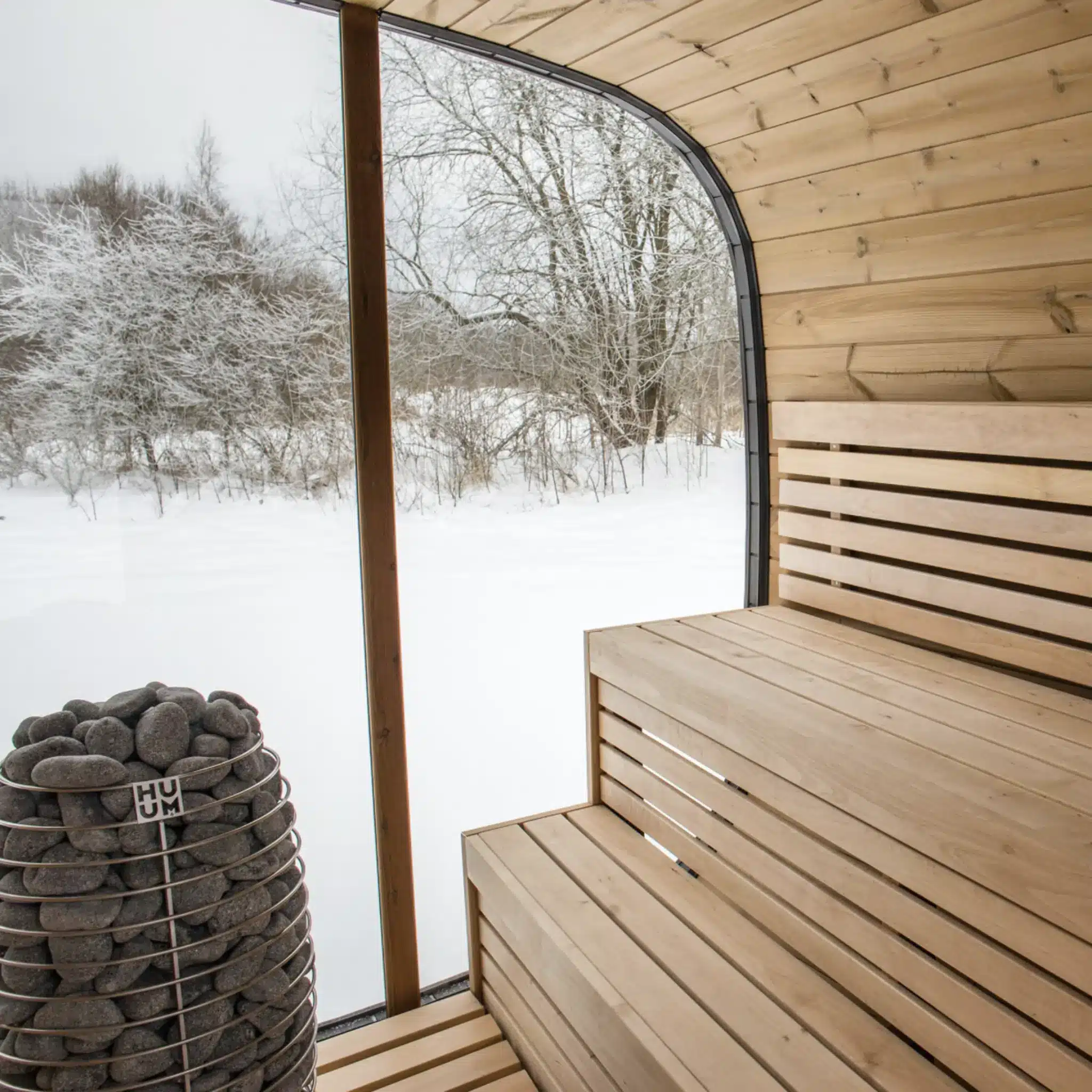Vision-sauna vie rentoutumisen uudelle tasolle yhdistämällä sisätilan lämmön luonnon kauneuteen. Sen kaareva ja avara lasietuosa luo katkeamattoman panoraamanäkymän, tuoden lumiset laaksot, rauhalliset järvet ja kultaiset auringonlaskut suoraan saunaelämykseen. Lauteet on suunnattu harkitusti näkymää kohti, jotta jokainen saunoja voi nauttia parhaasta mahdollisesta ja esteettömästä maisemasta. Jokaisesta saunahetkestä tulee rauhallinen, elämyksellinen ja meditatiivinen yhteys luontoon.
