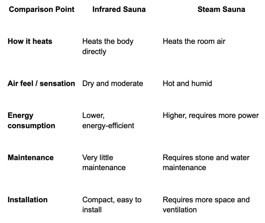An infrared sauna is better for small homes because it is compact, easy to install, and works well in a bathroom and sauna setup without extra ventilation. - Do infrared saunas use less electricity than steam saunas?