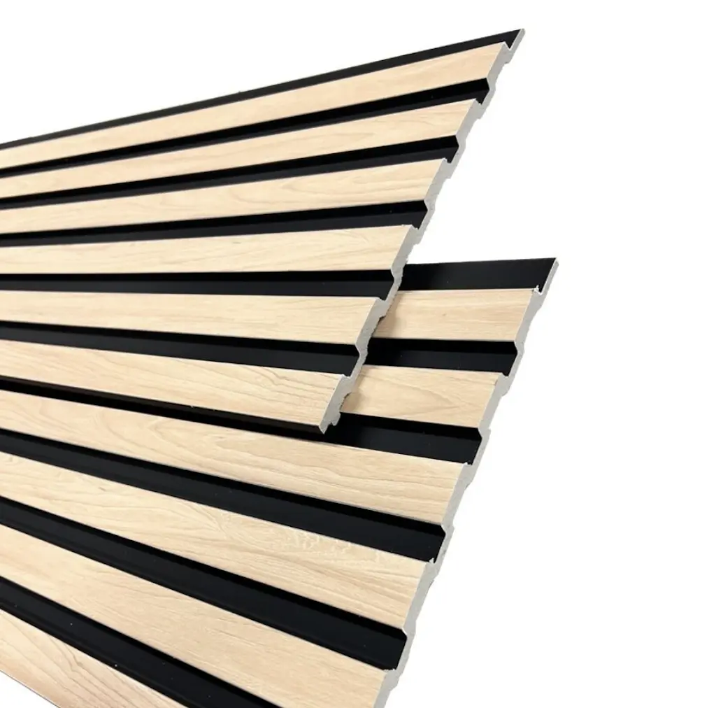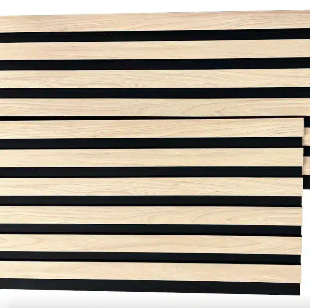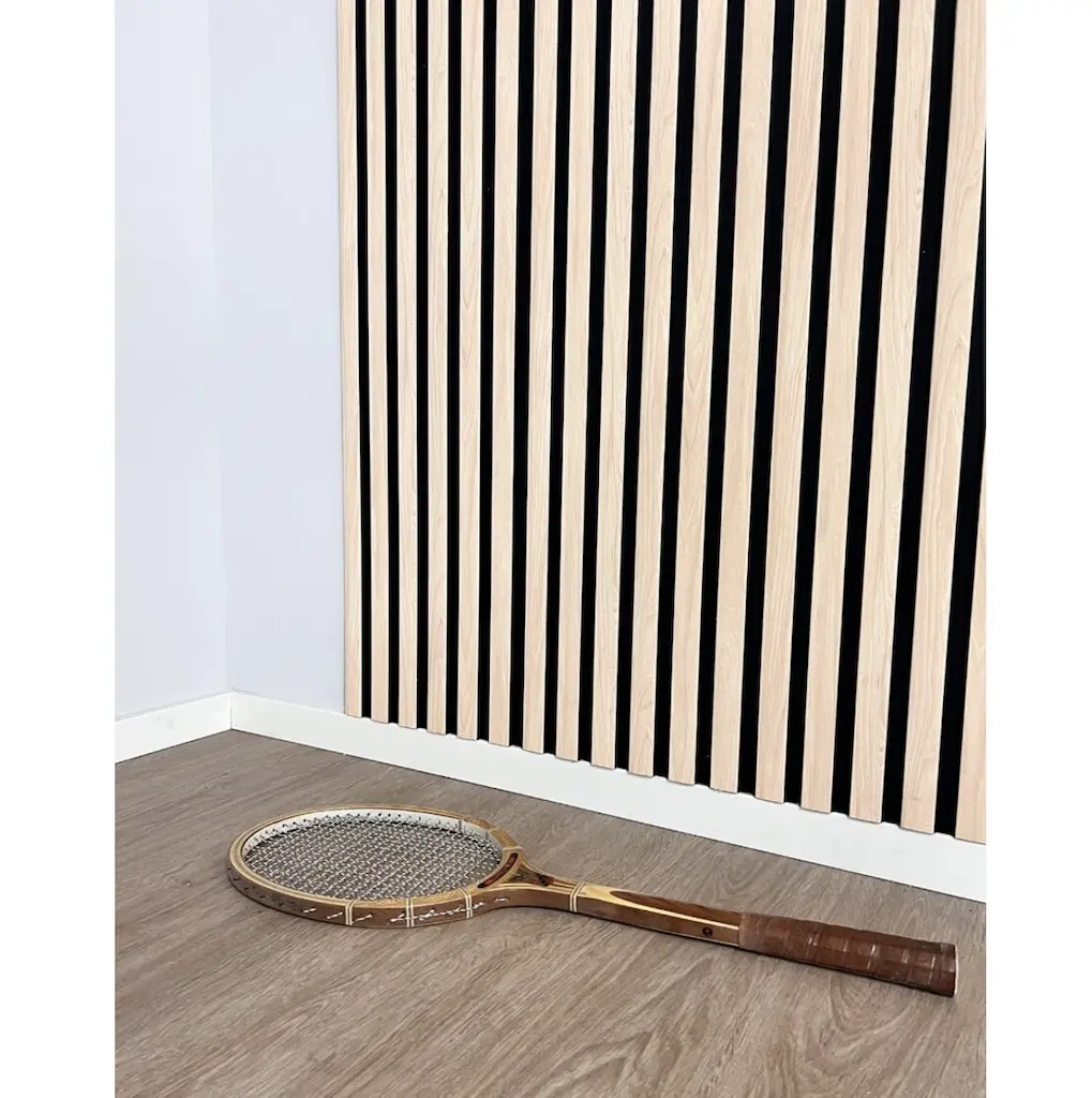 Low/wide-profile, stylish tongue-and-groove wall panel with a 3D design featuring a black base and a light birch wood-like pattern on top. It can be installed vertically or horizontally. The extra-wide model (300 mm) makes installation even easier, as more surface area is covered at once.