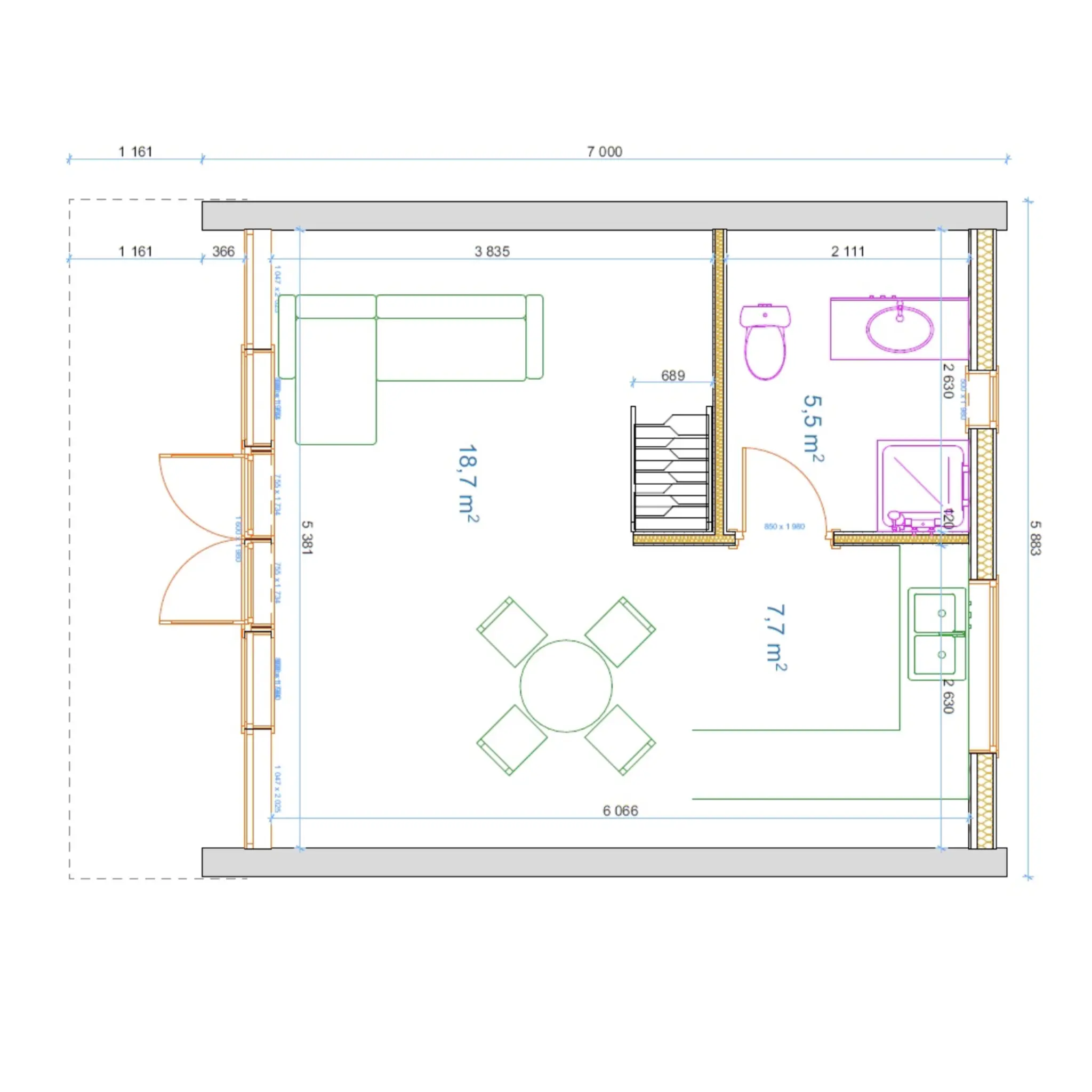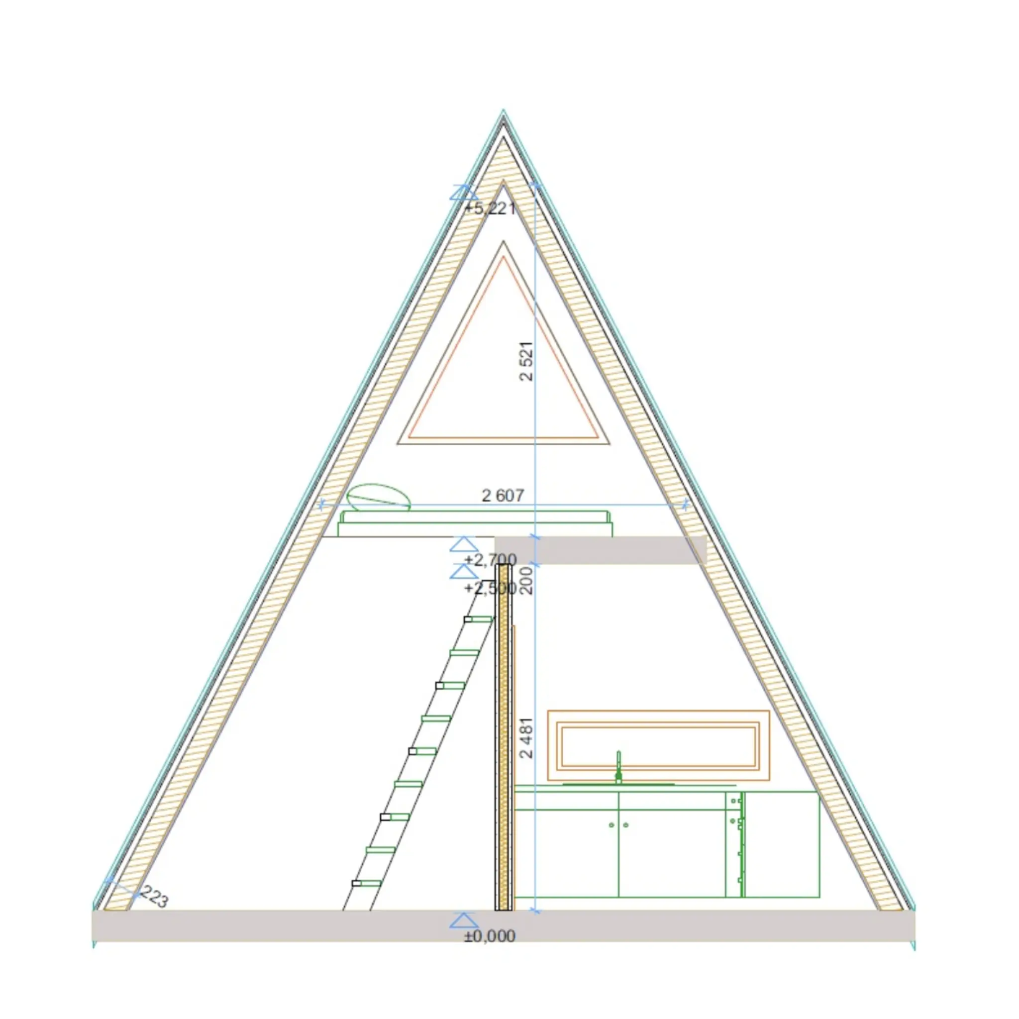 Furthermore, you can explore the details, such as: 14 cm thick walls, 20 cm thick roof with insulation, and 9 windows for optimal lighting. Create your ideal space with this unique A-house.