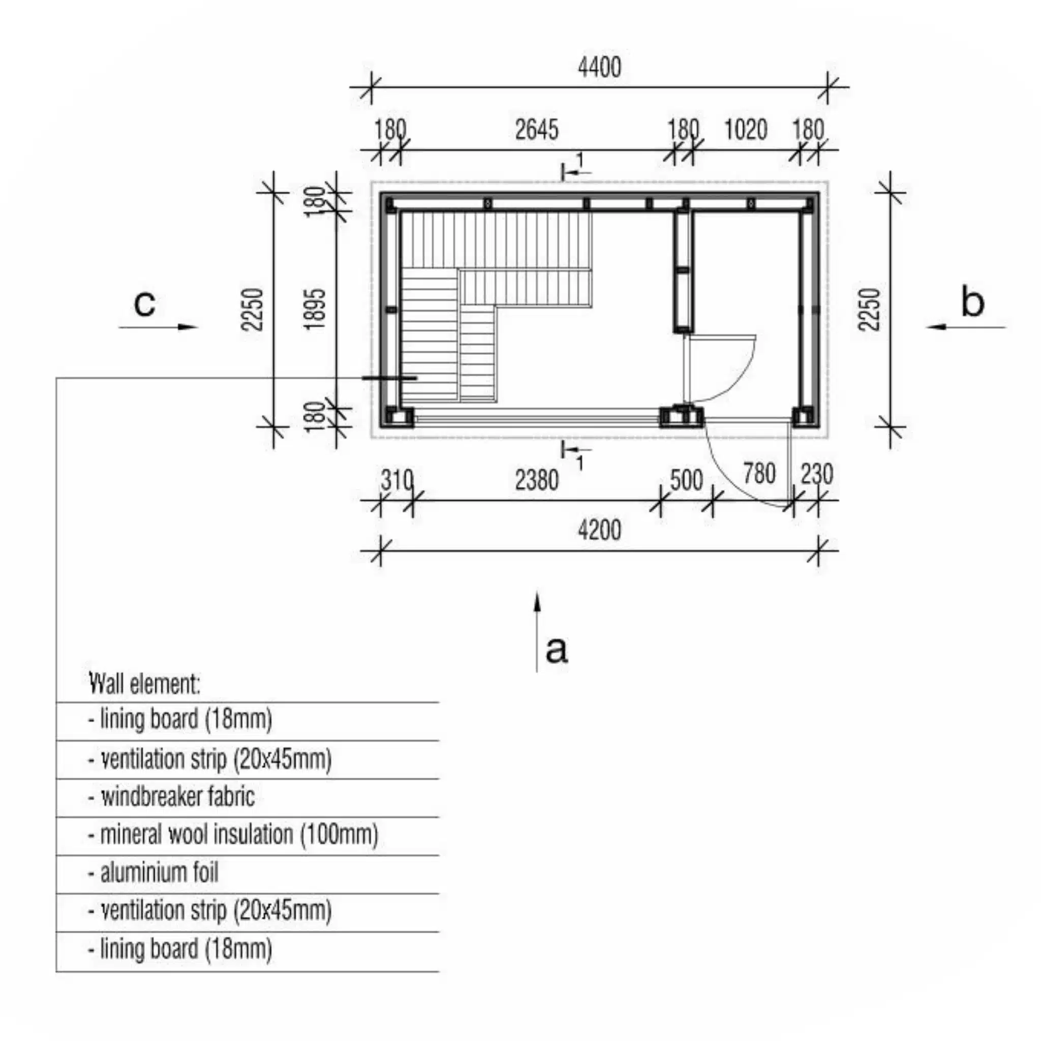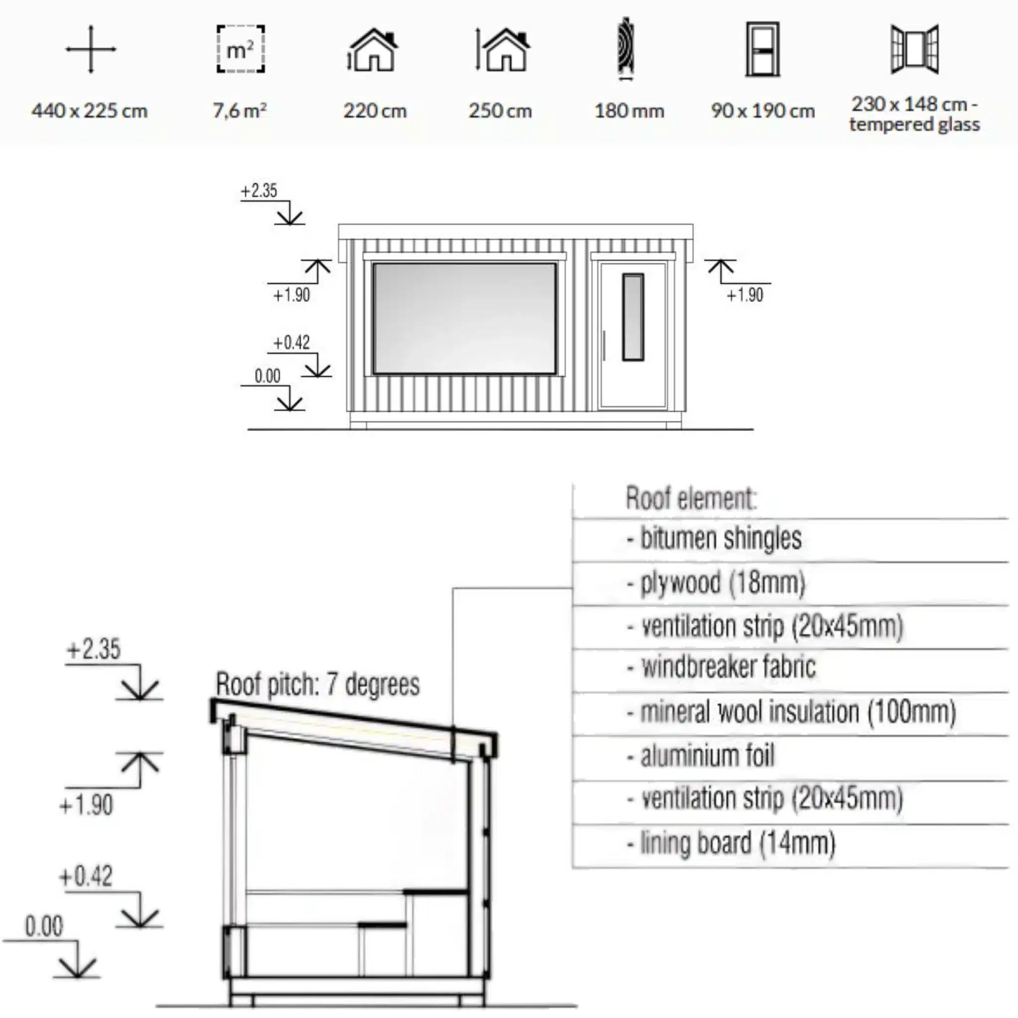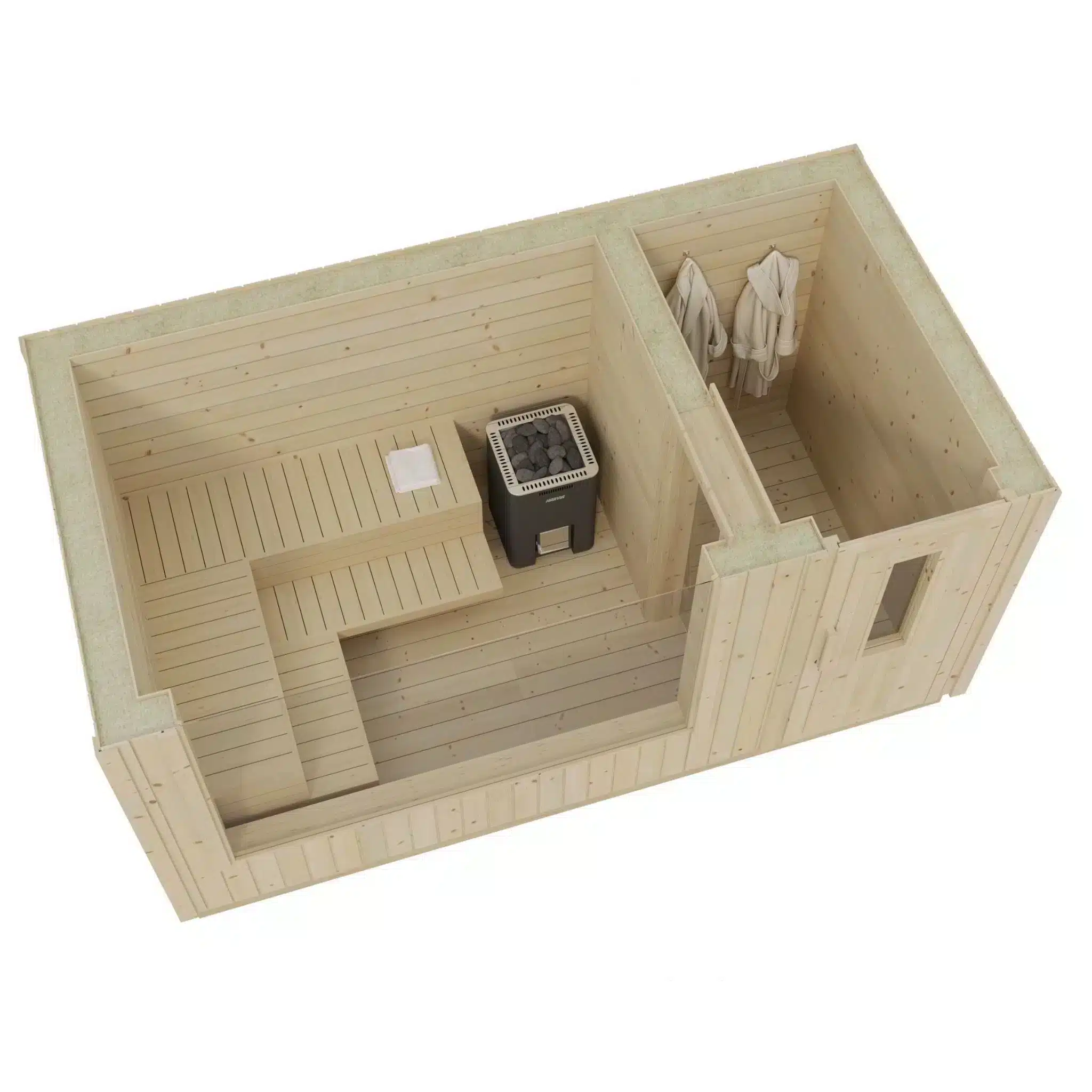 The Aada L sauna offers a spacious and practical solution for year-round relaxation, now with additional room and increased functionality. Measuring 4.4 x 2.2 m, this fully assembled and insulated sauna is designed to meet the needs of larger families or those seeking more versatile spaces. The extra room can be used as a dressing area or storage, while the main sauna room retains its high-quality design and features. The large panoramic window provides stunning views and natural light, creating a soothing atmosphere. Built with durable materials and 100 mm insulation, the Aada L sauna is crafted to withstand even the harshest weather conditions while maintaining optimal heat retention.