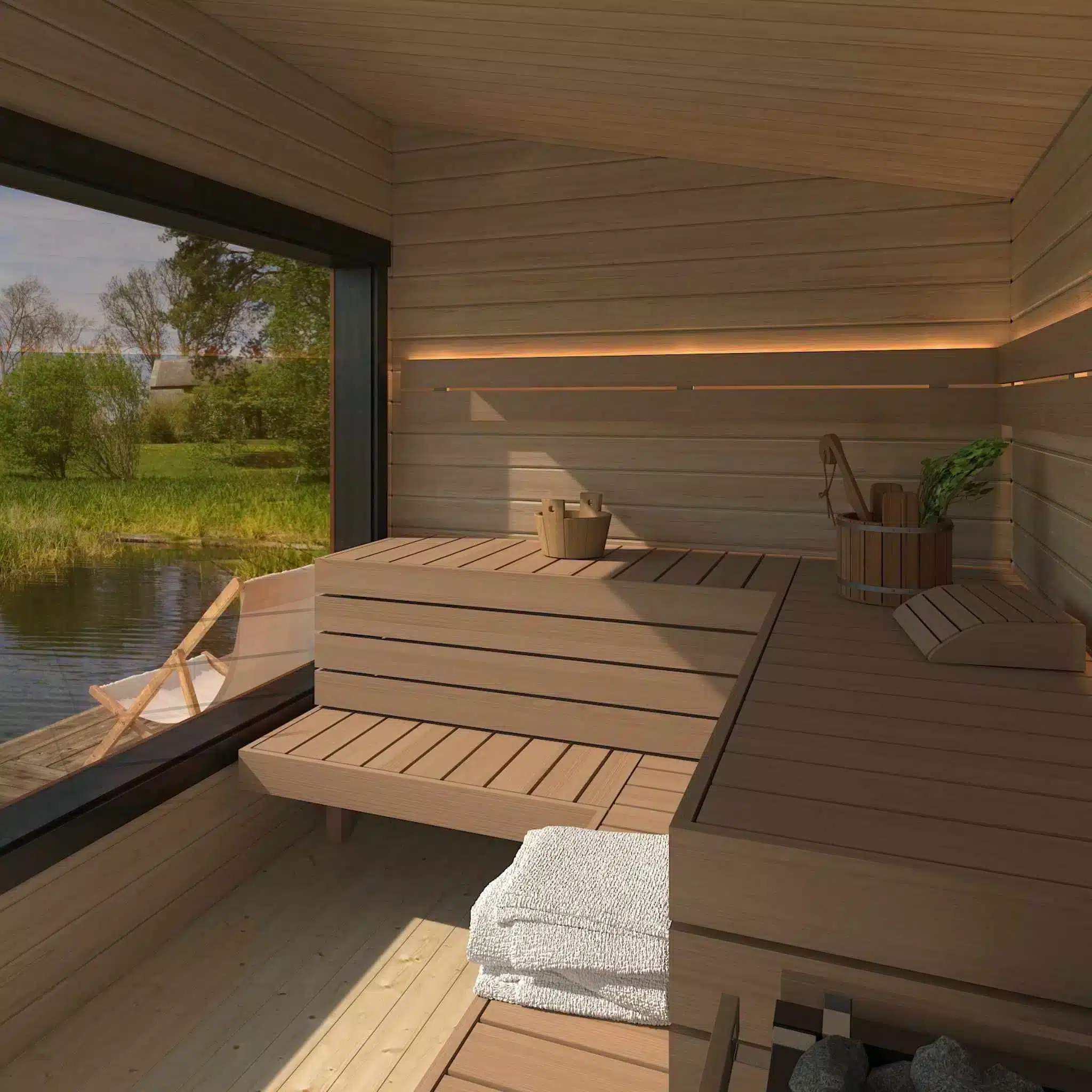 The Aada L sauna, measuring 4.4 x 2.2 m, is a spacious, fully assembled, and insulated sauna featuring an additional room for changing or storage. Its large panoramic window, ergonomic benches, and durable materials make it the perfect choice for year-round relaxation and functionality.
