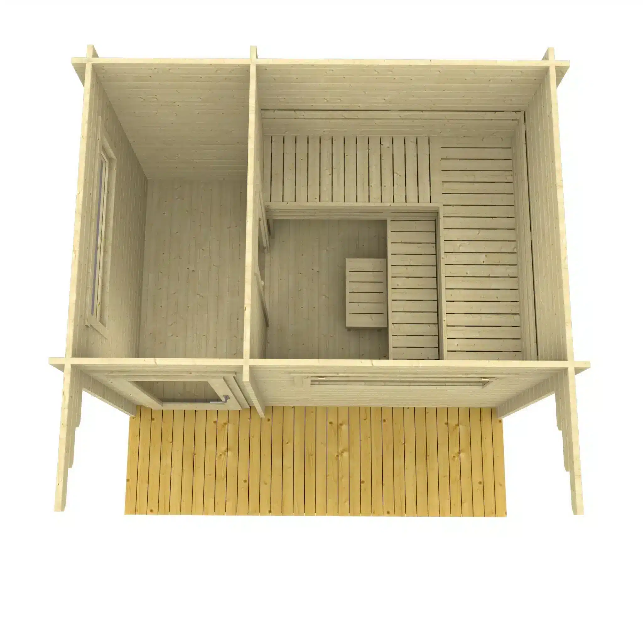 The Ahti L Flat sauna 3.4 x 2.3m combines modern design with functionality, featuring a flat roof and an additional customizable room. With high-quality materials and insulated roof elements, it offers a premium sauna experience for your home.
