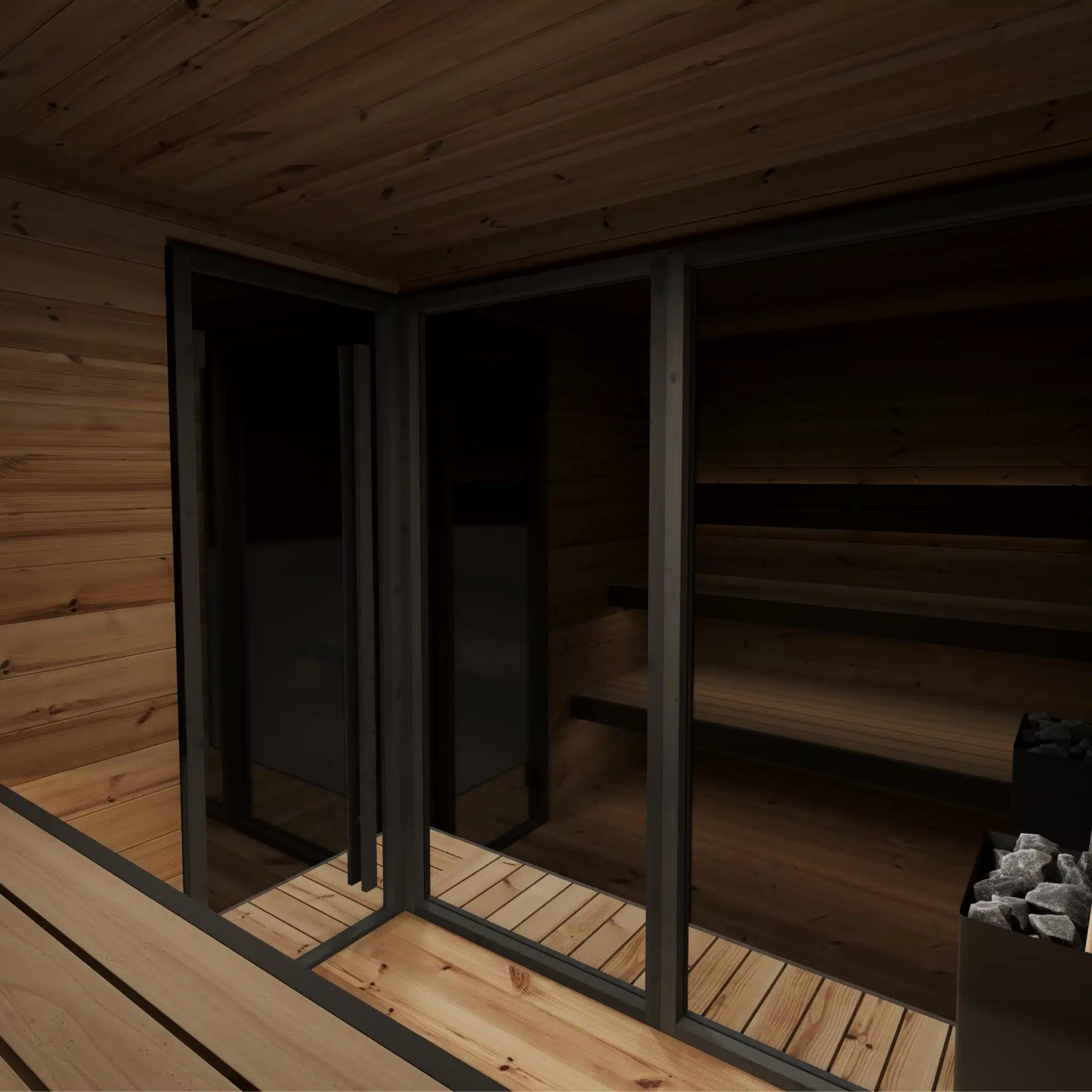 The 6.3 m³ interior is perfectly sized for personal rituals or shared moments. Two-tiered benches in smooth thermo-aspen cradle you in natural comfort. The large bronze-tinted glass surfaces invite in daylight while maintaining a sense of privacy and serenity. Every material – inside and out – has been chosen for both beauty and durability, ensuring that ARYA weathers time as gracefully as it welcomes it.