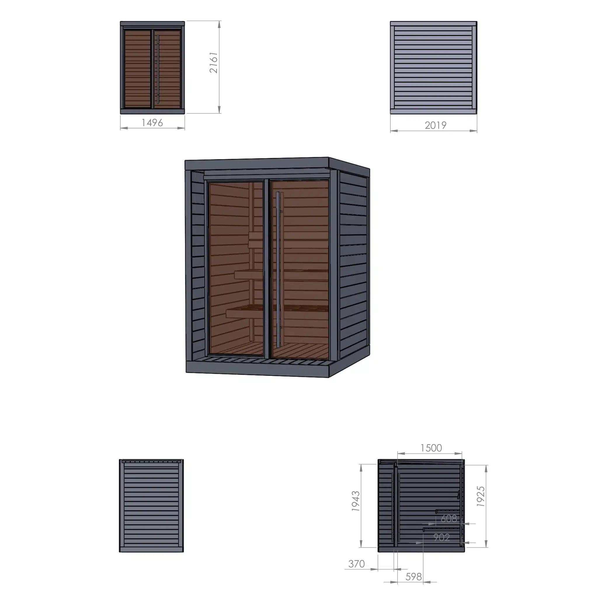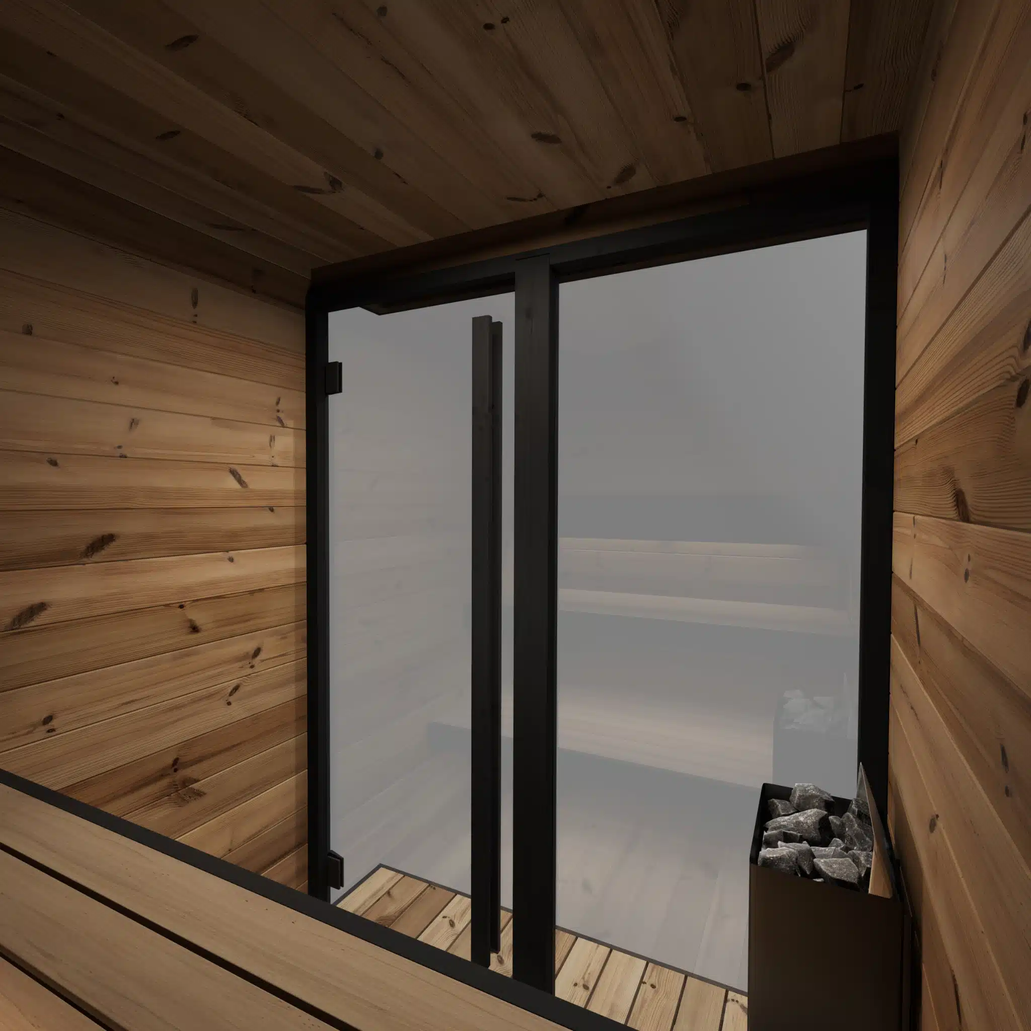 Whether installed on a terrace or beside a lake, ARYA S creates a peaceful corner for everyday renewal. The 4.1 m³ interior is ideal for solo sauna sessions or intimate relaxation. The two-tier thermo-aspen benches provide ergonomic comfort, while the bronze-tinted glass surfaces allow light to flow in without sacrificing privacy.