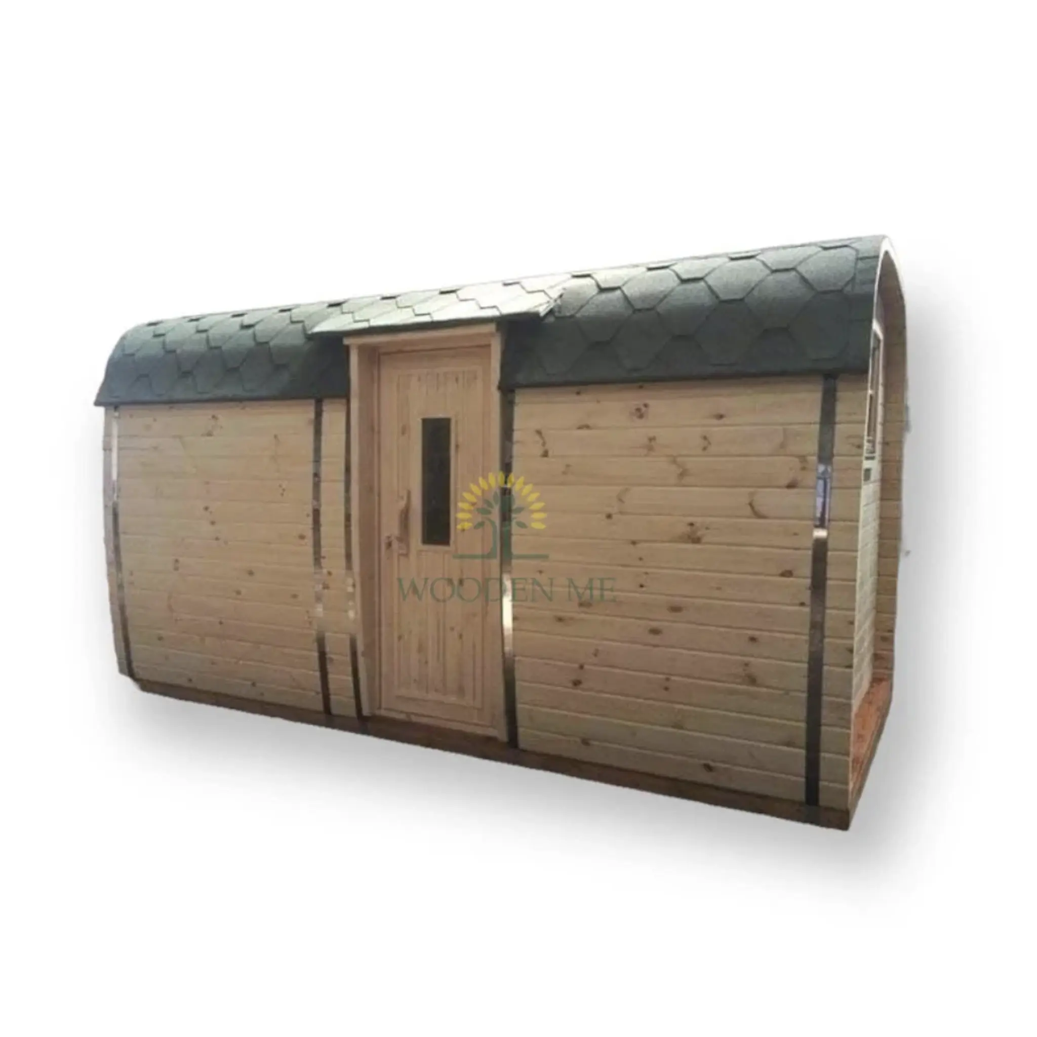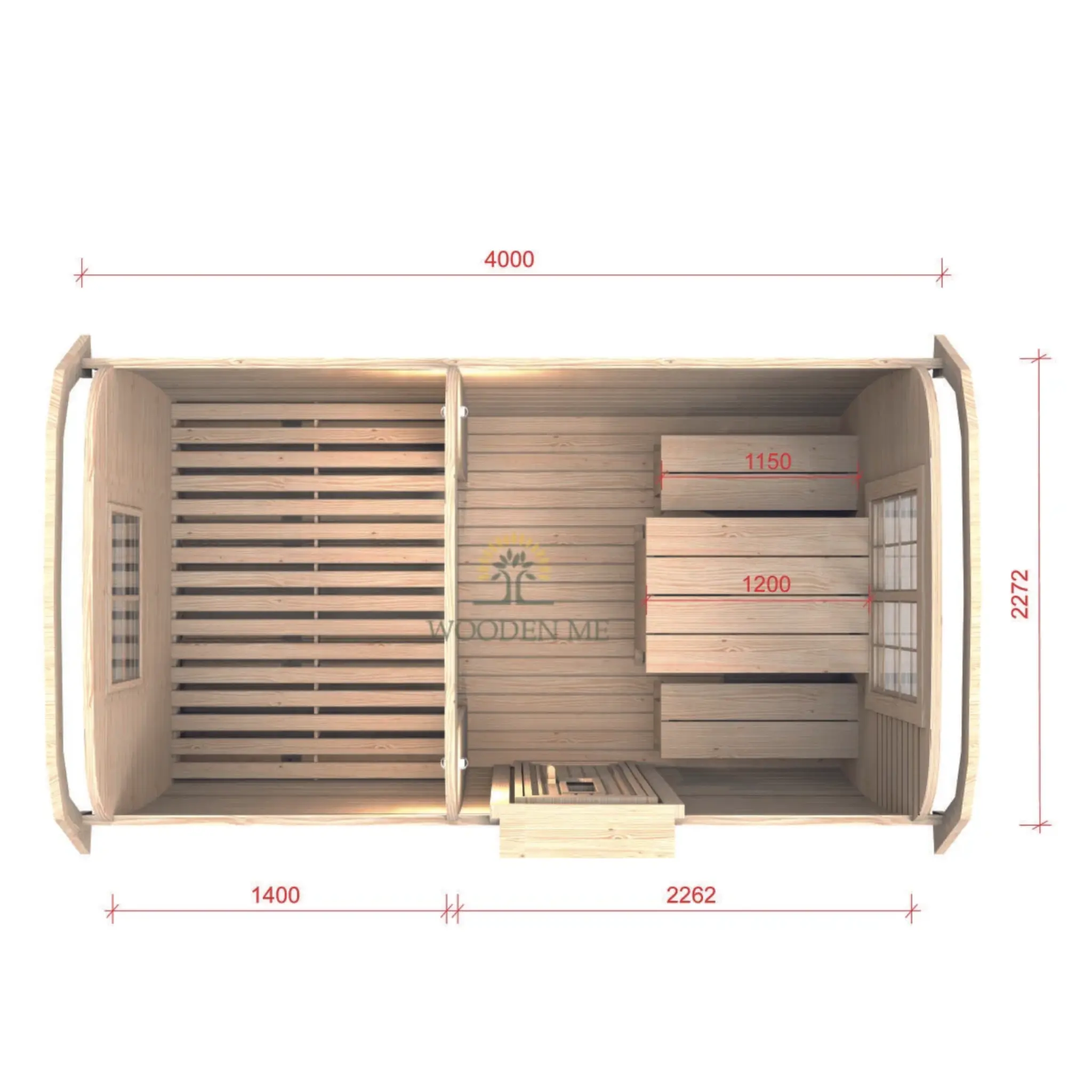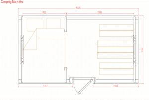 Our Camping Bus 4 m is a wooden cabin that has two rooms: one for sleeping and one for living. The sleeping room has a double bed, while the living room has a sofa bed and a kitchenette. You can easily convert the sofa bed into another double bed if you need more sleeping space. Furthermore, the cabin has two large windows at the front and back, as well as a side door with a window, allowing you to enjoy the scenic views and feel closer to nature.