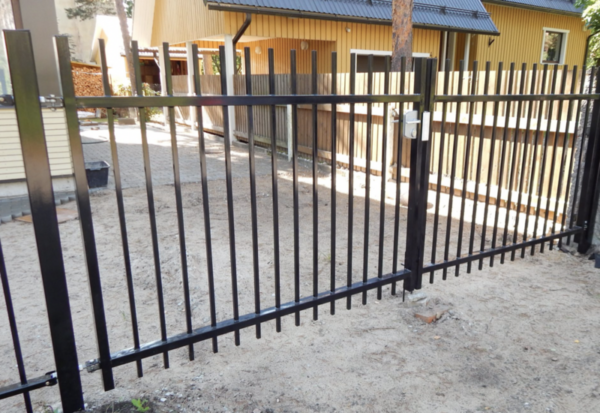 Car gate to toe rail ~4000 mm. The width of one side of the gate is 2000 mm. The surface is galvanized and painted with powder paint (black).