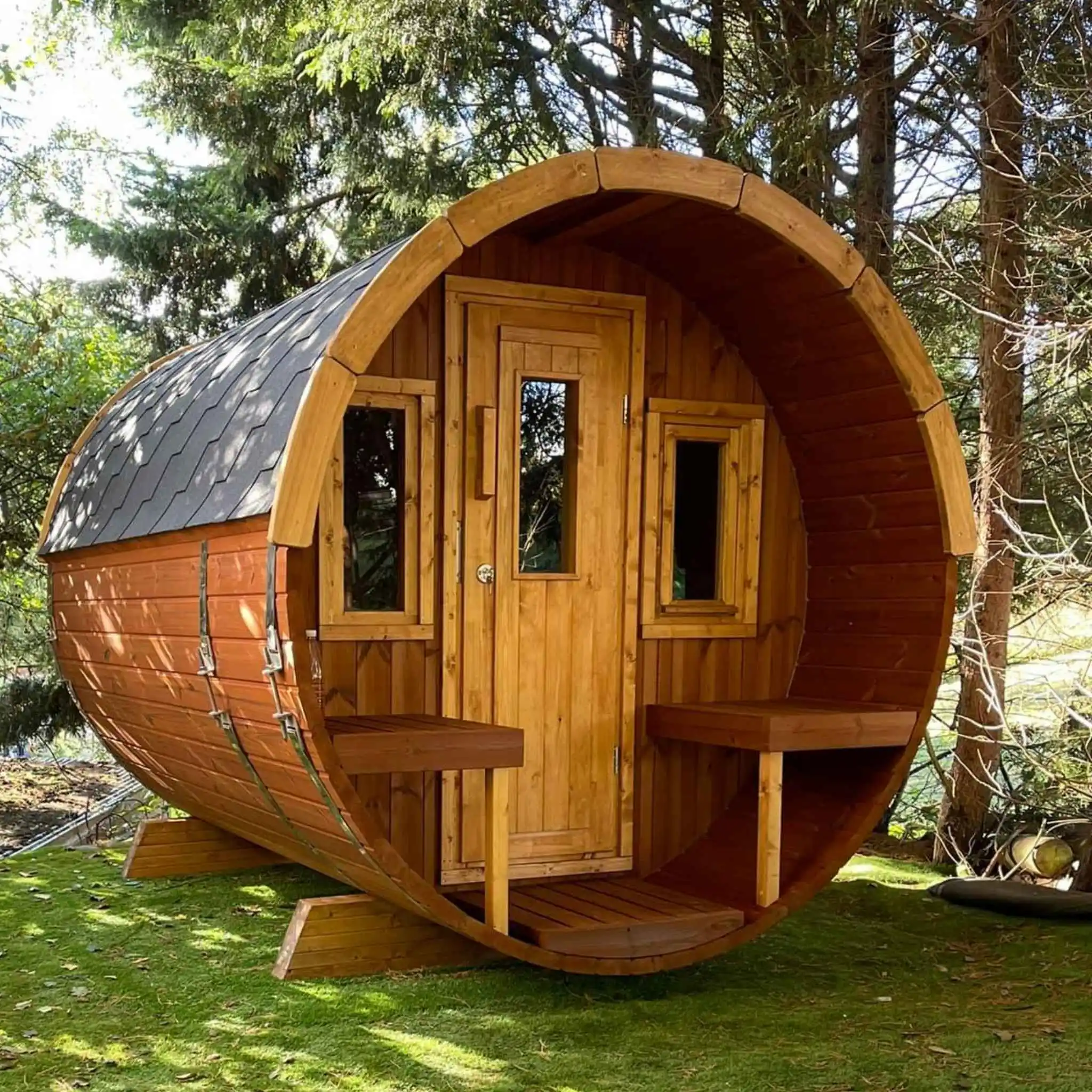 The barrel shape promotes efficient heat circulation, ensuring a comfortable sauna experience. Ideal for gardens, backyards, or lakeside retreats, this sauna is perfect for those seeking relaxation and functionality in a timeless design. Whether used at a lakeside cottage or your home, the Ehala 330 is a blend of comfort, practicality, and Nordic charm.