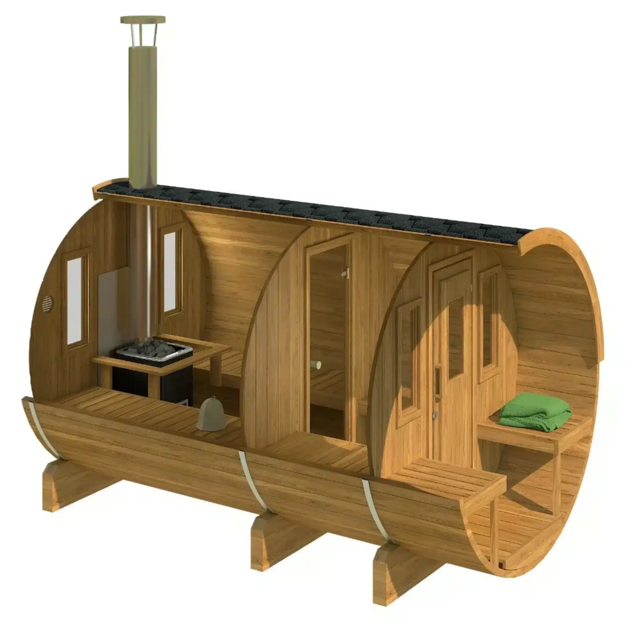 Upgrade your outdoor living with the Ehala 330 thermowood barrel sauna. With its durable thermowood construction, changing room, and cozy terrace, this 3.3-meter sauna comfortably accommodates six people for the ultimate relaxation experience.