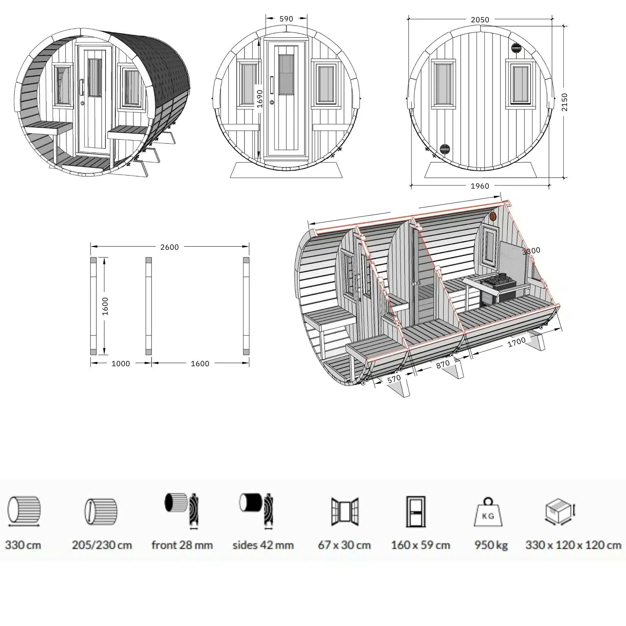 The Ehala 330 barrel sauna combines traditional sauna craftsmanship with modern design. Made from durable thermowood, this sauna offers enhanced weather resistance, durability, and a sleek, natural finish that fits seamlessly into any outdoor space. With its 3.3-meter length, it provides ample space for up to six people and includes a changing room and a cozy terrace for cooling off after a relaxing sauna session.
