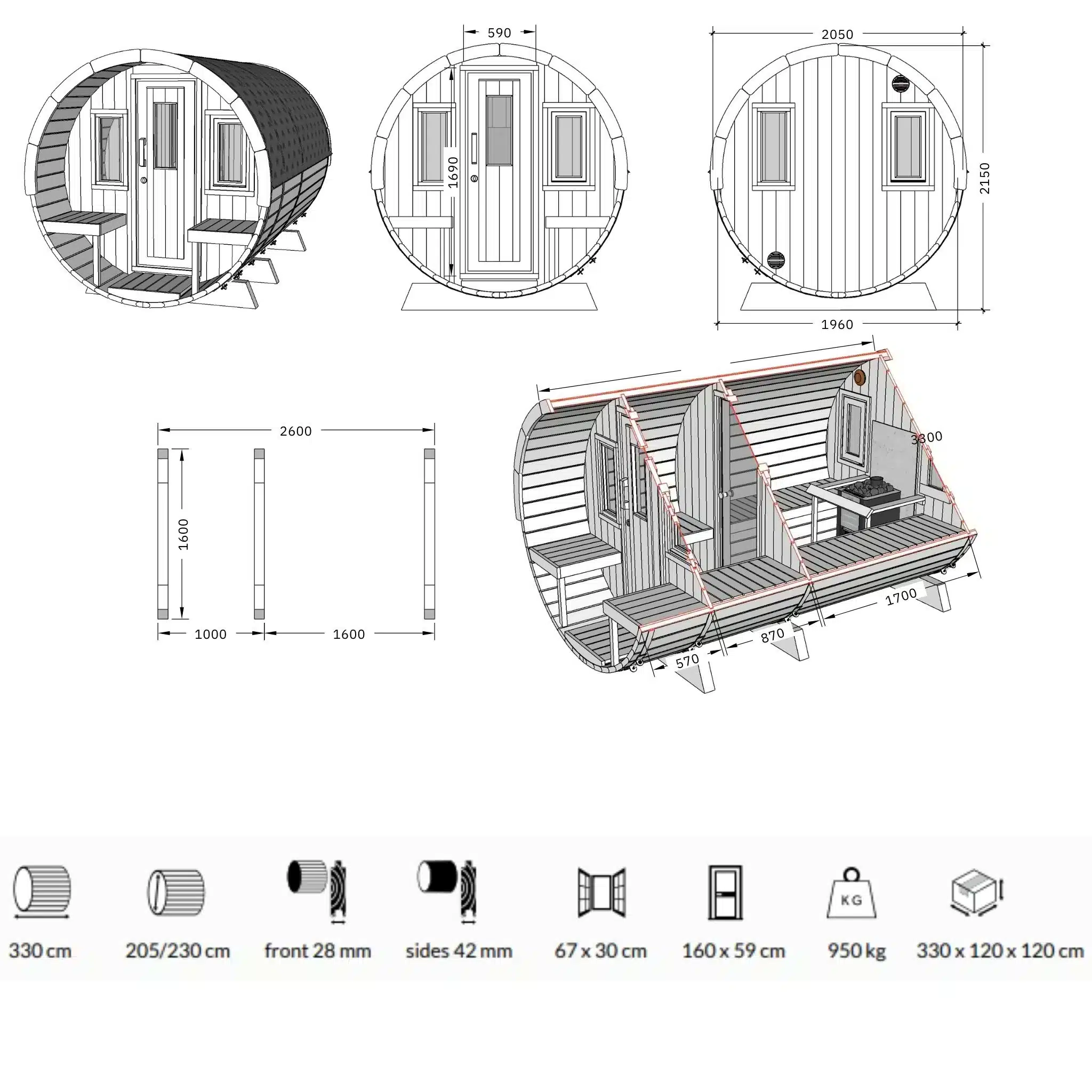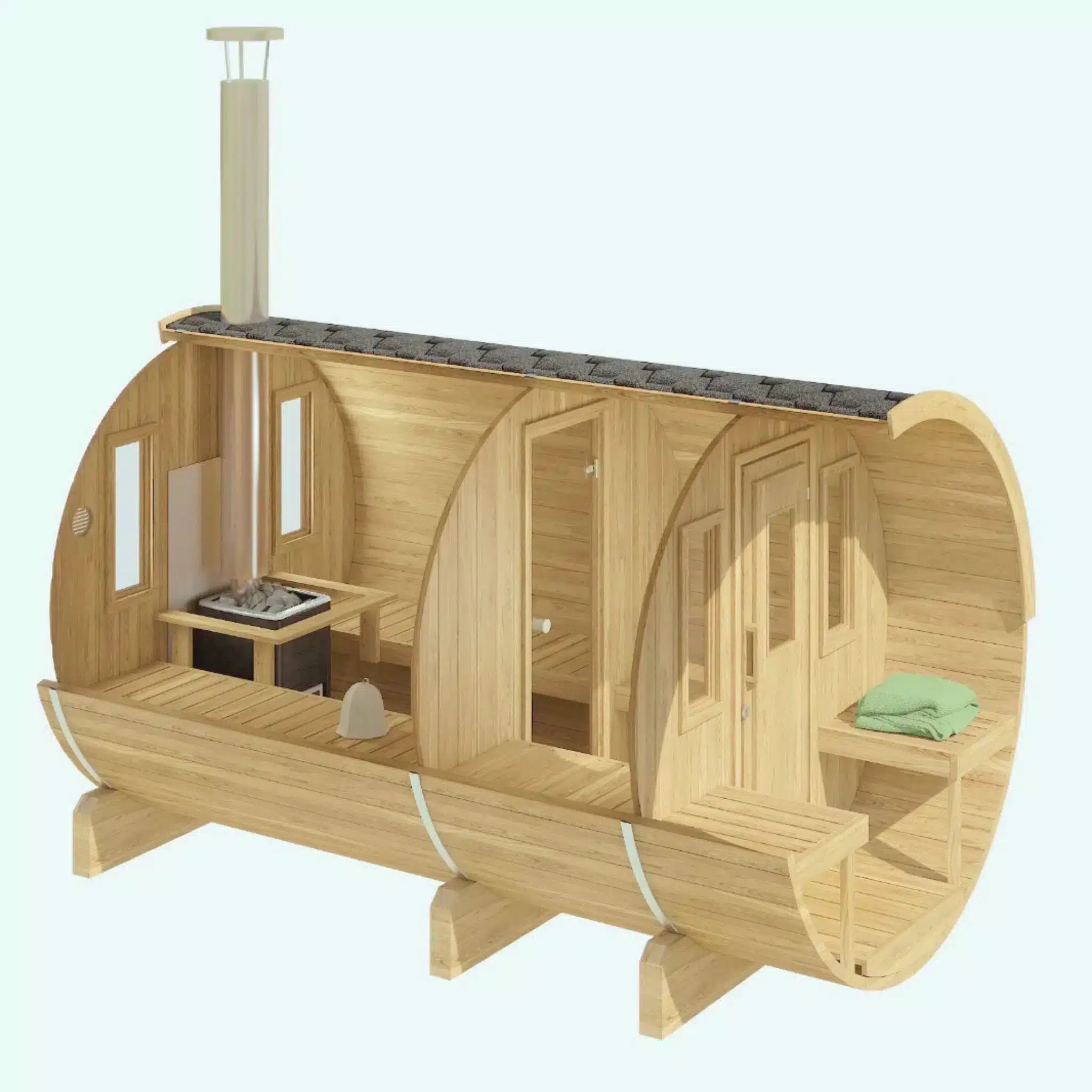 Ehala 330 barrel sauna offers a perfect combination of design, functionality, and practicality. With a spacious 3.3-meter length, integrated terrace seating, and a separate changing room, this sauna provides a premium experience for up to six people. Crafted from high-quality wood, it blends effortlessly into any backyard, garden, or lakeside property.